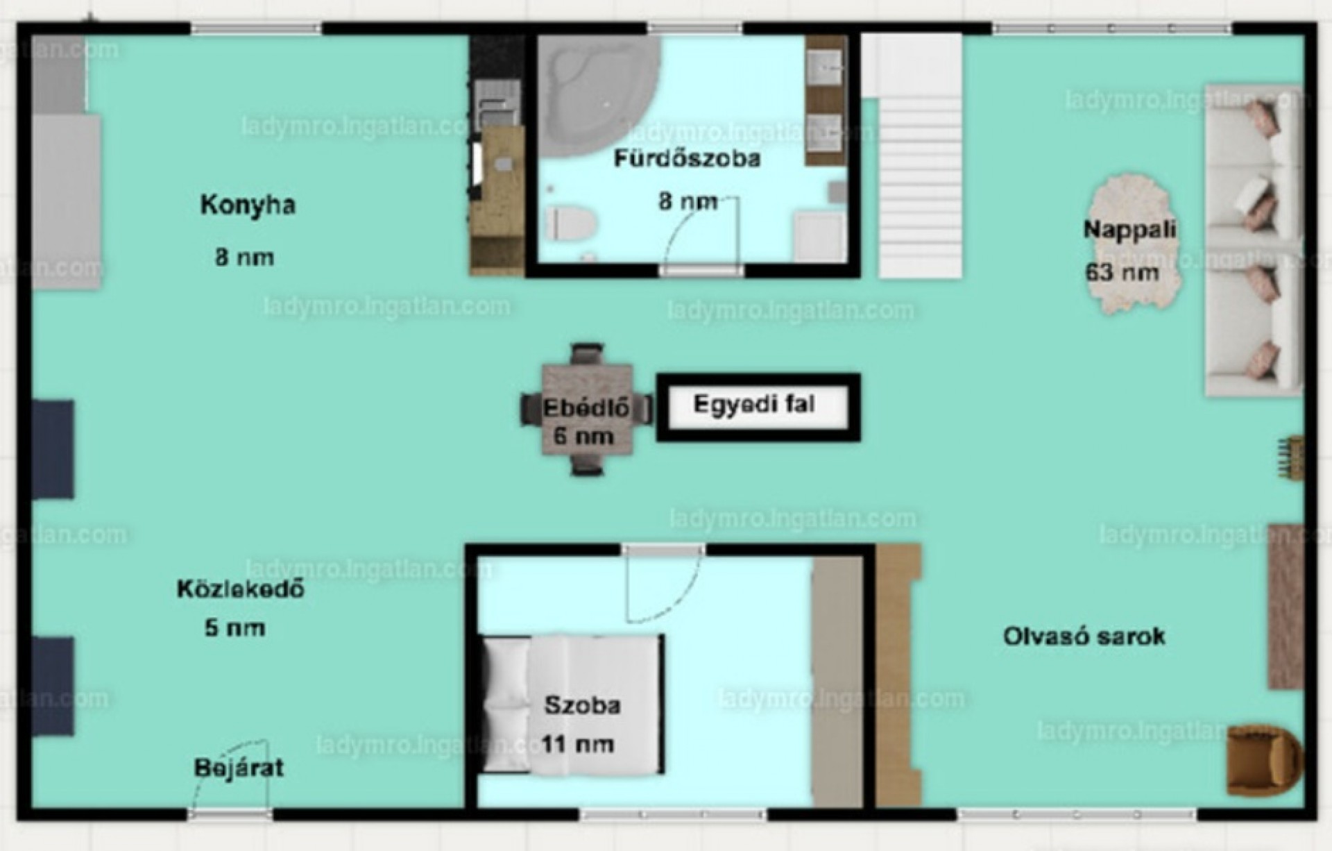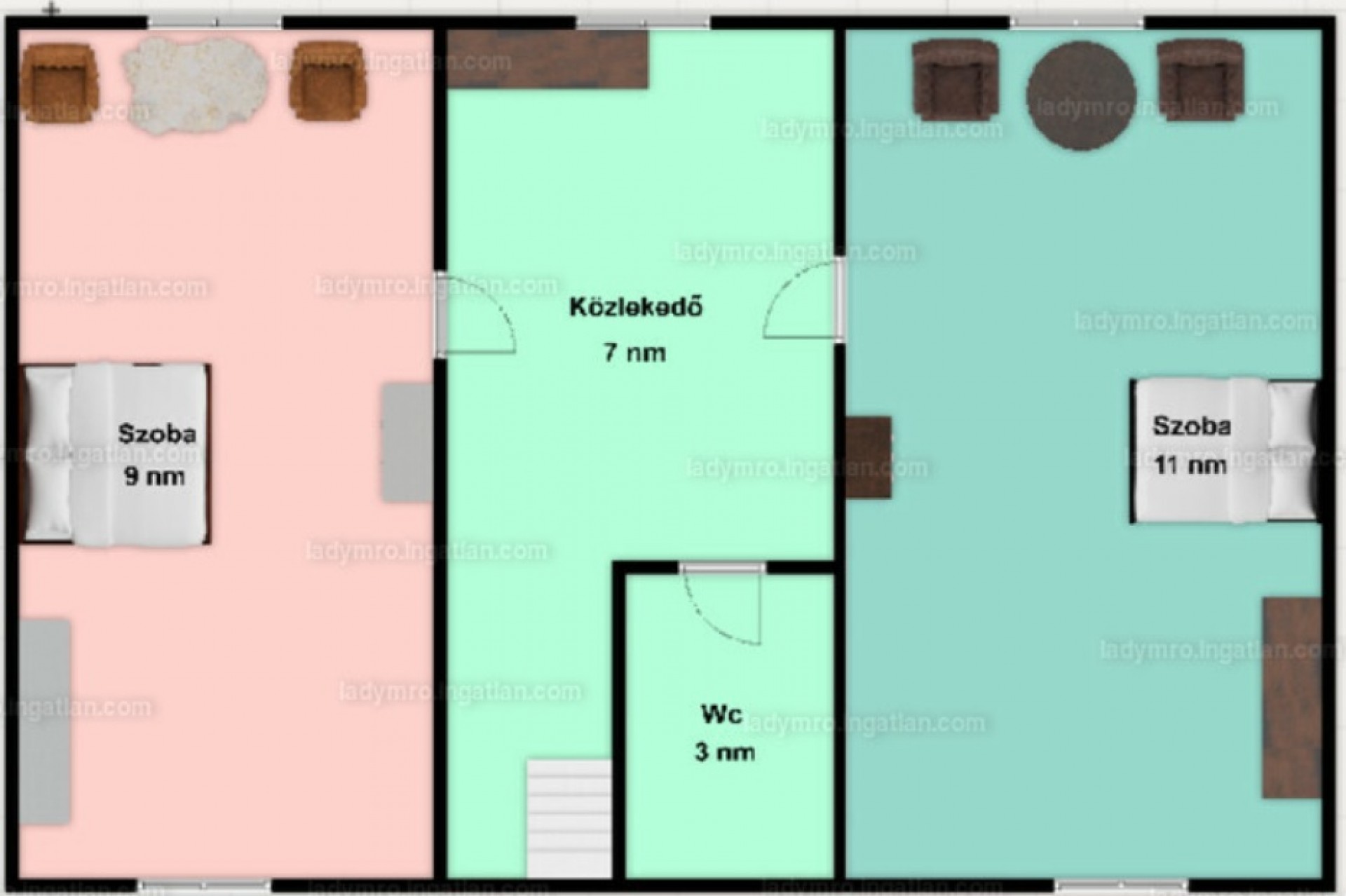 A földszinten tágas nappali-konyha-étkező, hálószoba és egy nagy fürdőszoba található, az emeleten 2 hálószoba és egy mosdó wc-vel.