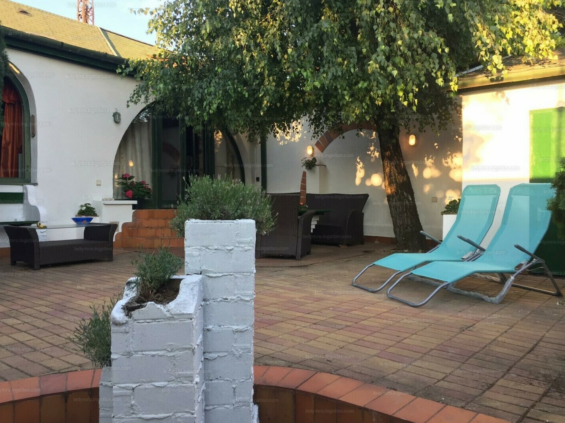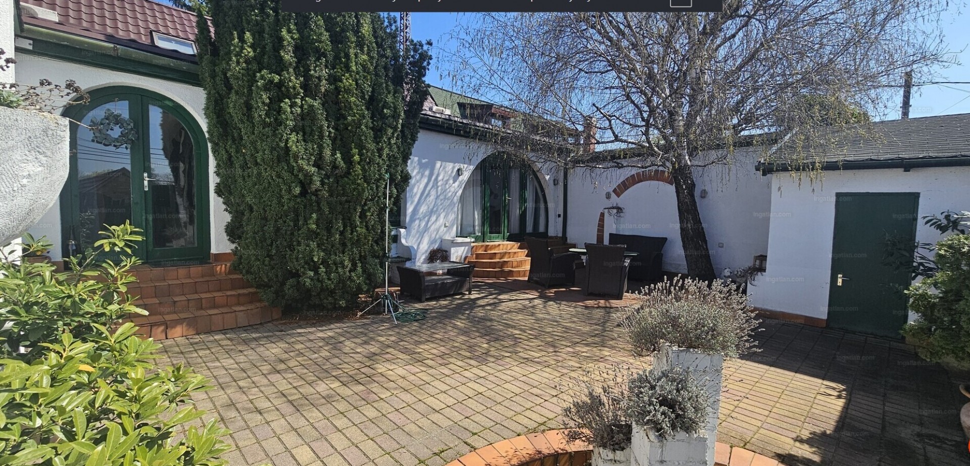 Az ingatlan 100 négyzetméteres telken helyezkedik el, ahol a letisztult térkőburkolatú kert tovább fokozza a hangulatot.