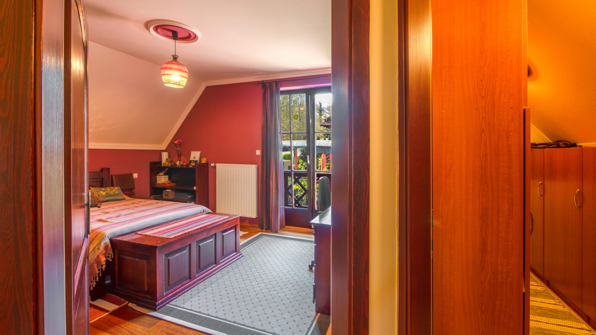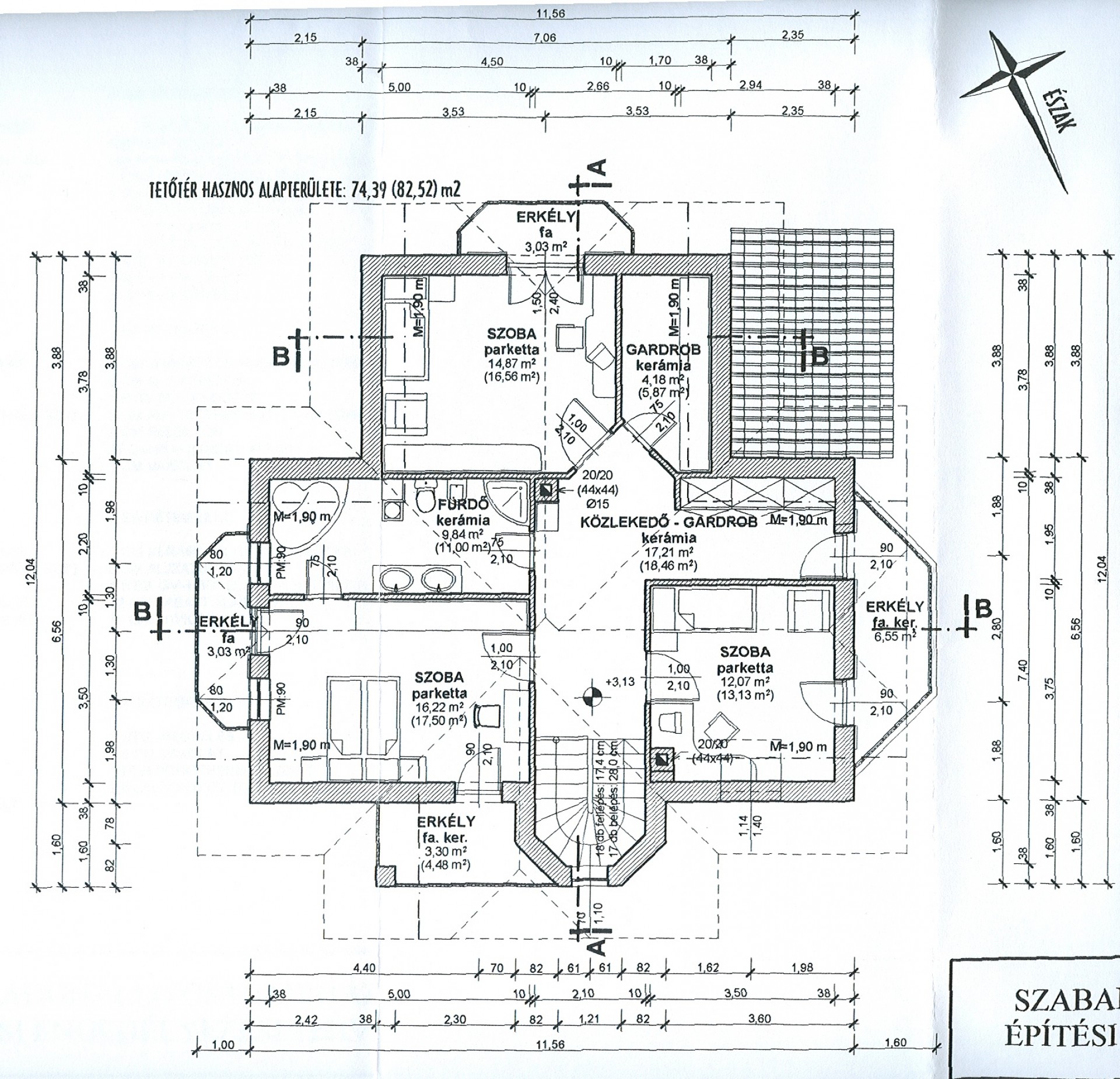 Az emeleten, a tetőtérben pedig a közlekedő 17.21 m2, gardrób 5.87 m2, fürdőszoba 11 m2, 3 darab hálószoba, melyek 16.56 m2, 17.5 m2 és 13.13 m2 nagyságúak. Összesen 74.39 m2.