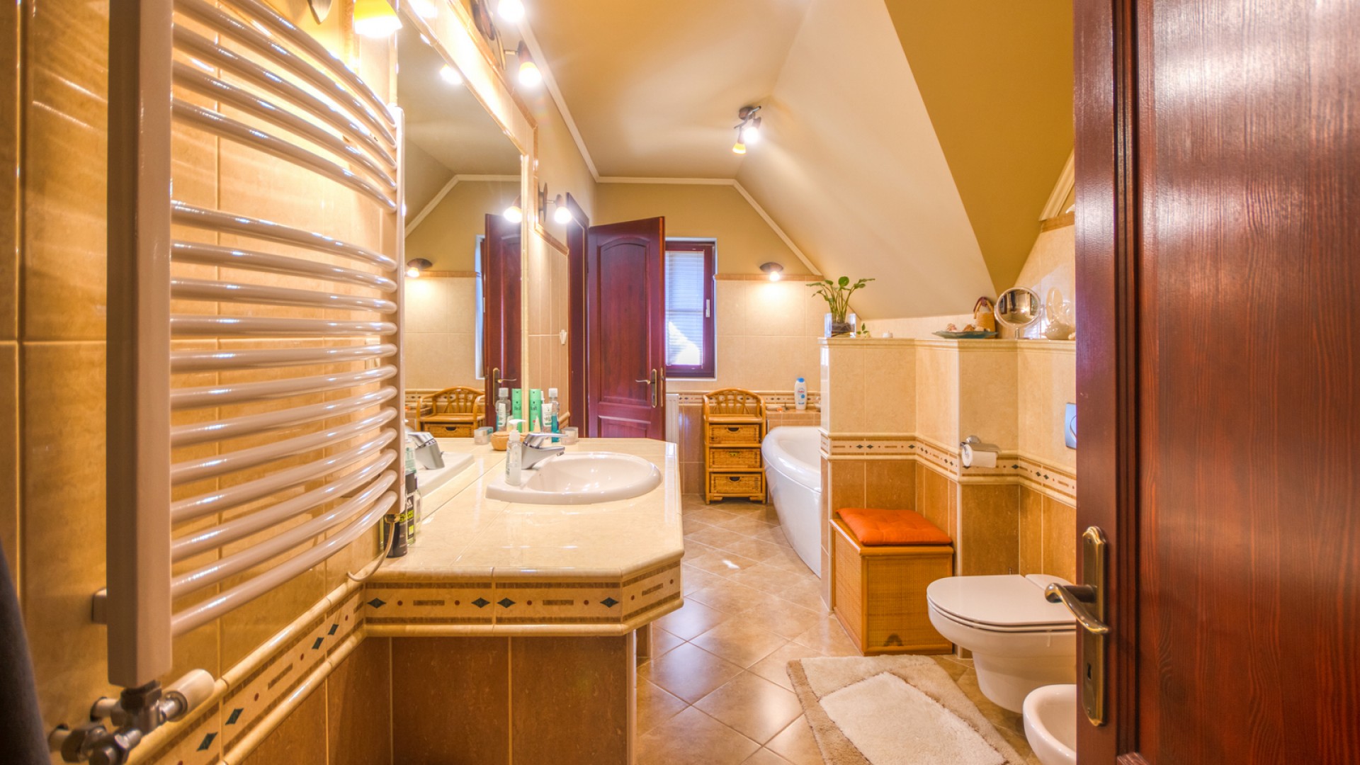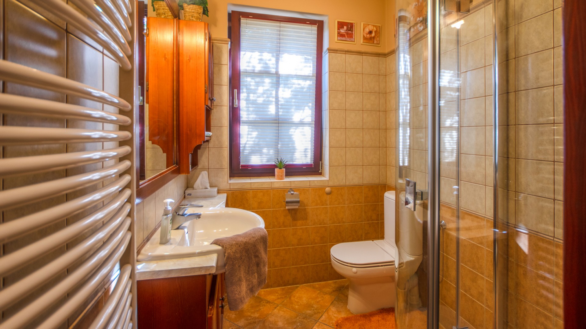 A pincében és a földszinten található fürdőszoba zuhanyzós, az emeleti pedig káddal és zuhanyzóval szerelt. A nappaliban, étkezőben és a négy szobában hűtő-fűtő légkondicionáló rendszer van beépítve, a 6 beltéri egységhez 2 külső egység tartozik. Alternatív fűtési lehetőség a nappaliban található fatüzelésű kandalló.