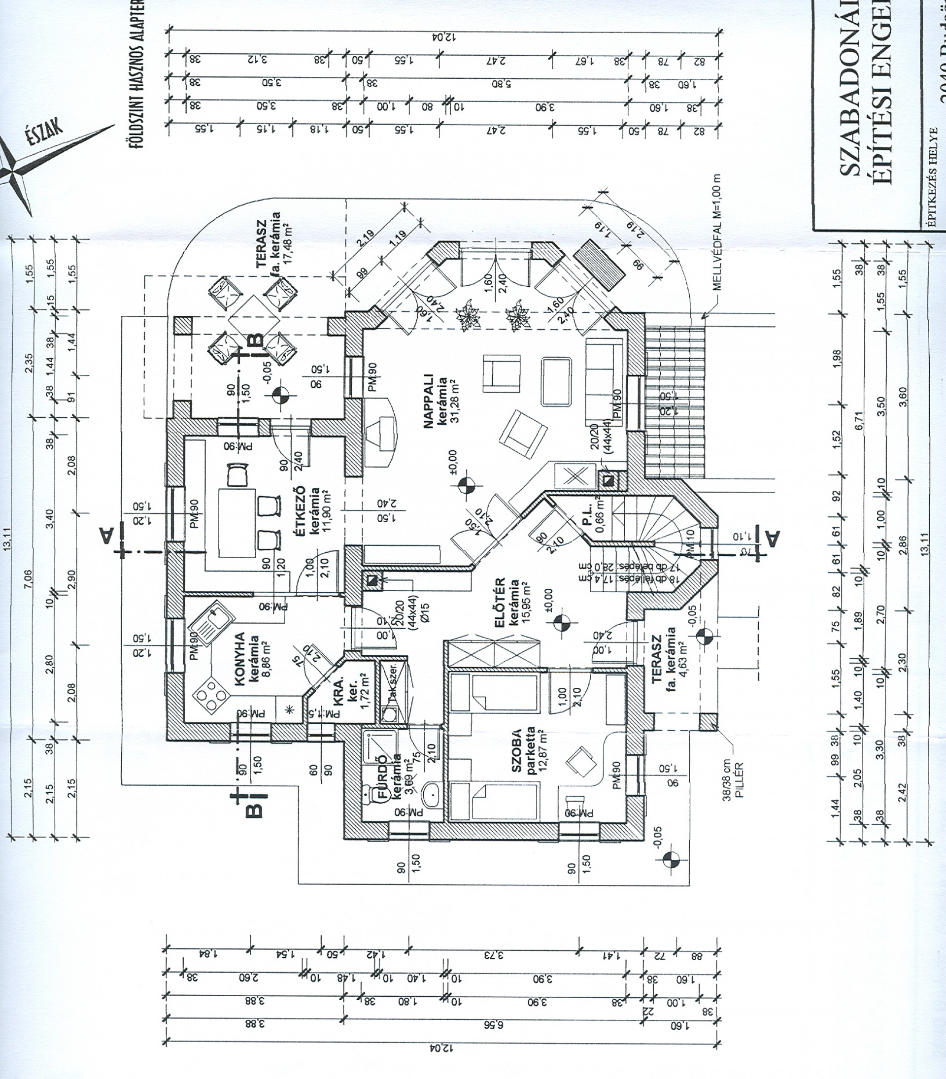 A földszinten van az előszoba 15.95 m2, dolgozó szoba 12.87 m2, nappali 31.28 m2, fürdőszoba 3.69 m2, konyha 8,86 m2, kamra 1.72 m2, étkező 11.9 m2. Összesen: 86.27 m2.