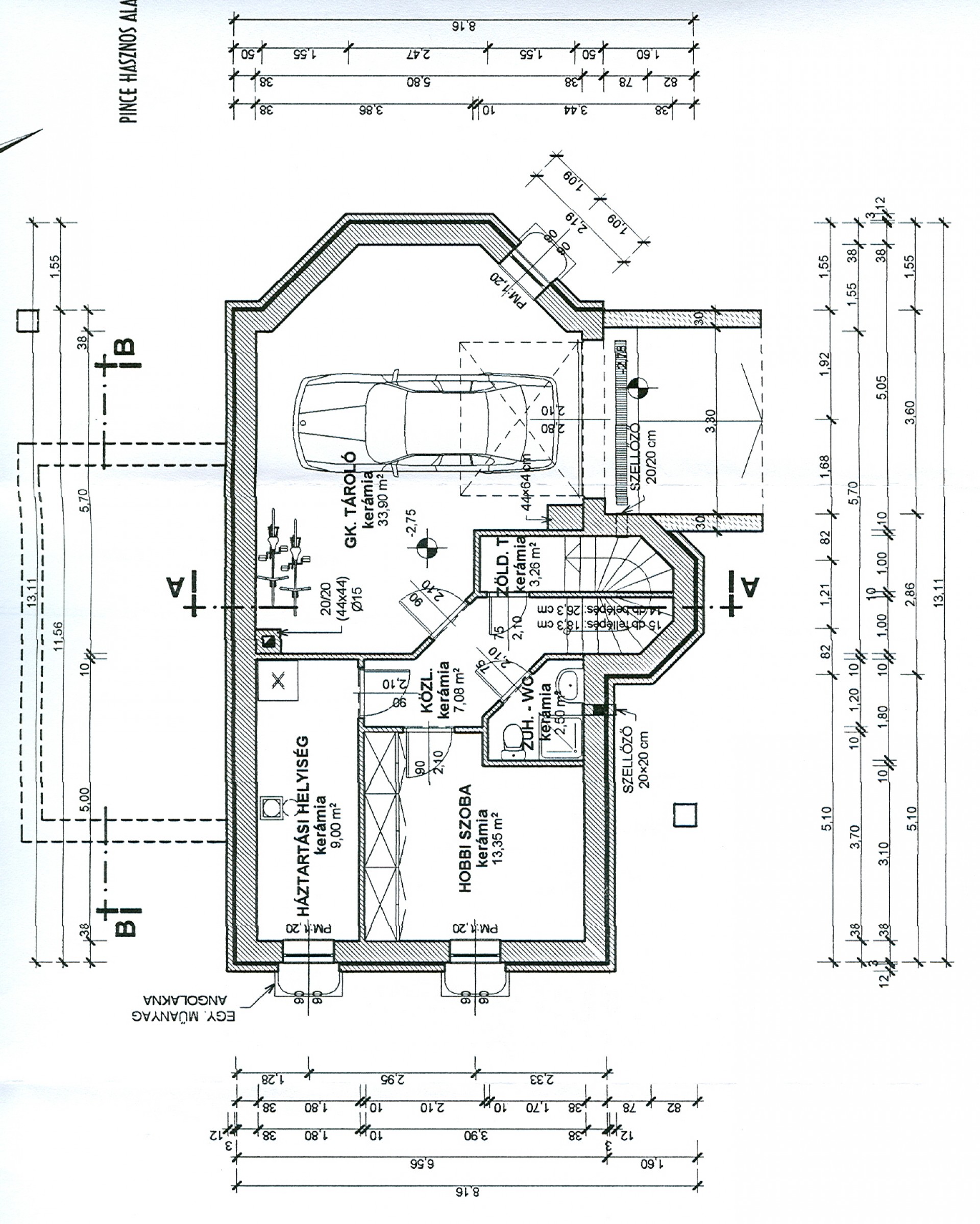 A pinceszinten található a gépkocsitároló 33.9 m2, gépészeti helység és mosókonyha 11.74 m2, tároló 11.4 m2, kamra 3.26 m2 és fürdőszoba 2.67 m2. Összesen 69 m2.