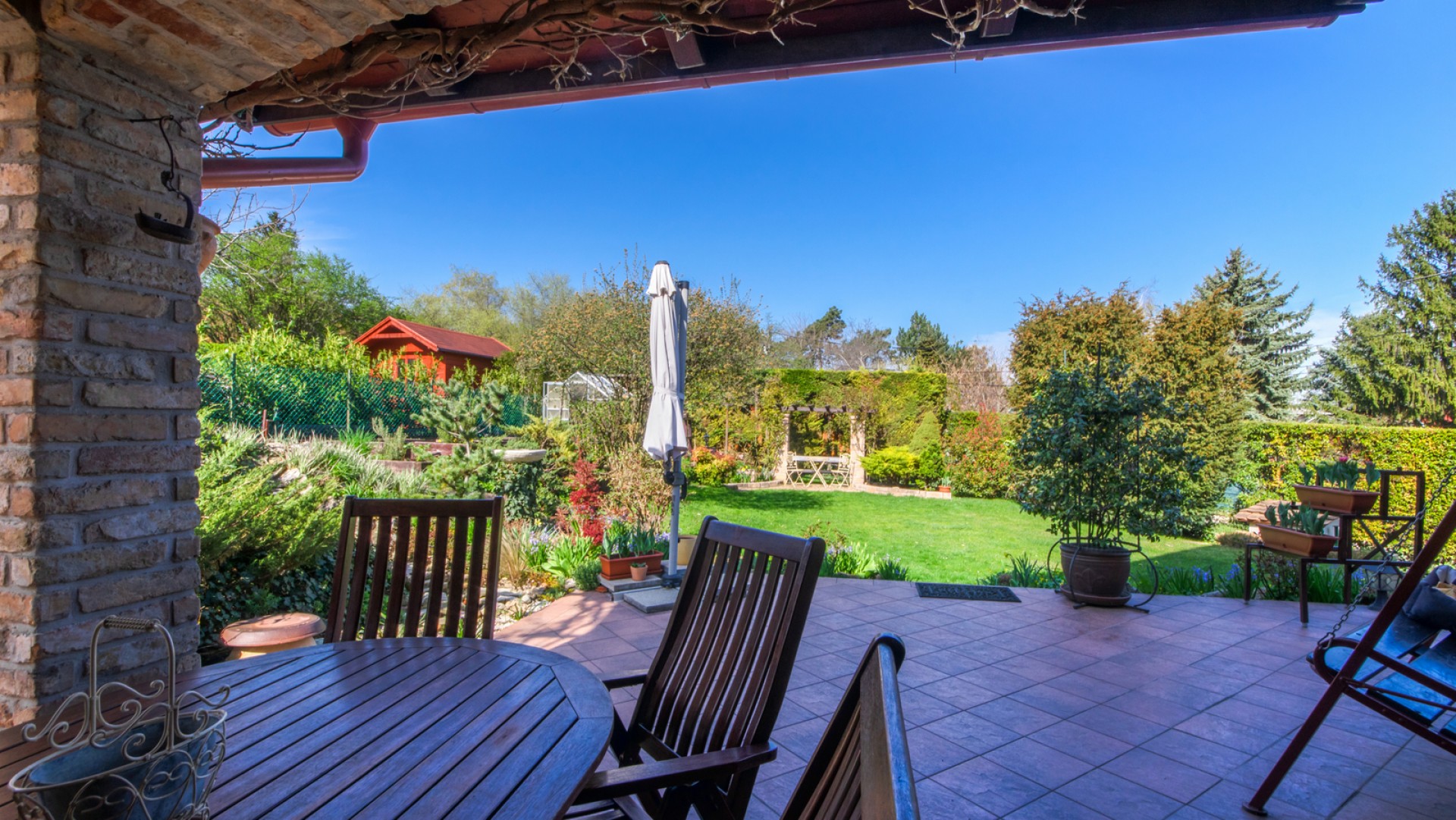 A kertben fedett, oldalt nyitott grillező, bográcsozó hely van, bontott téglából, gránit munkalapokkal, amihez az elektromos és vízhálózat is ki van építve.