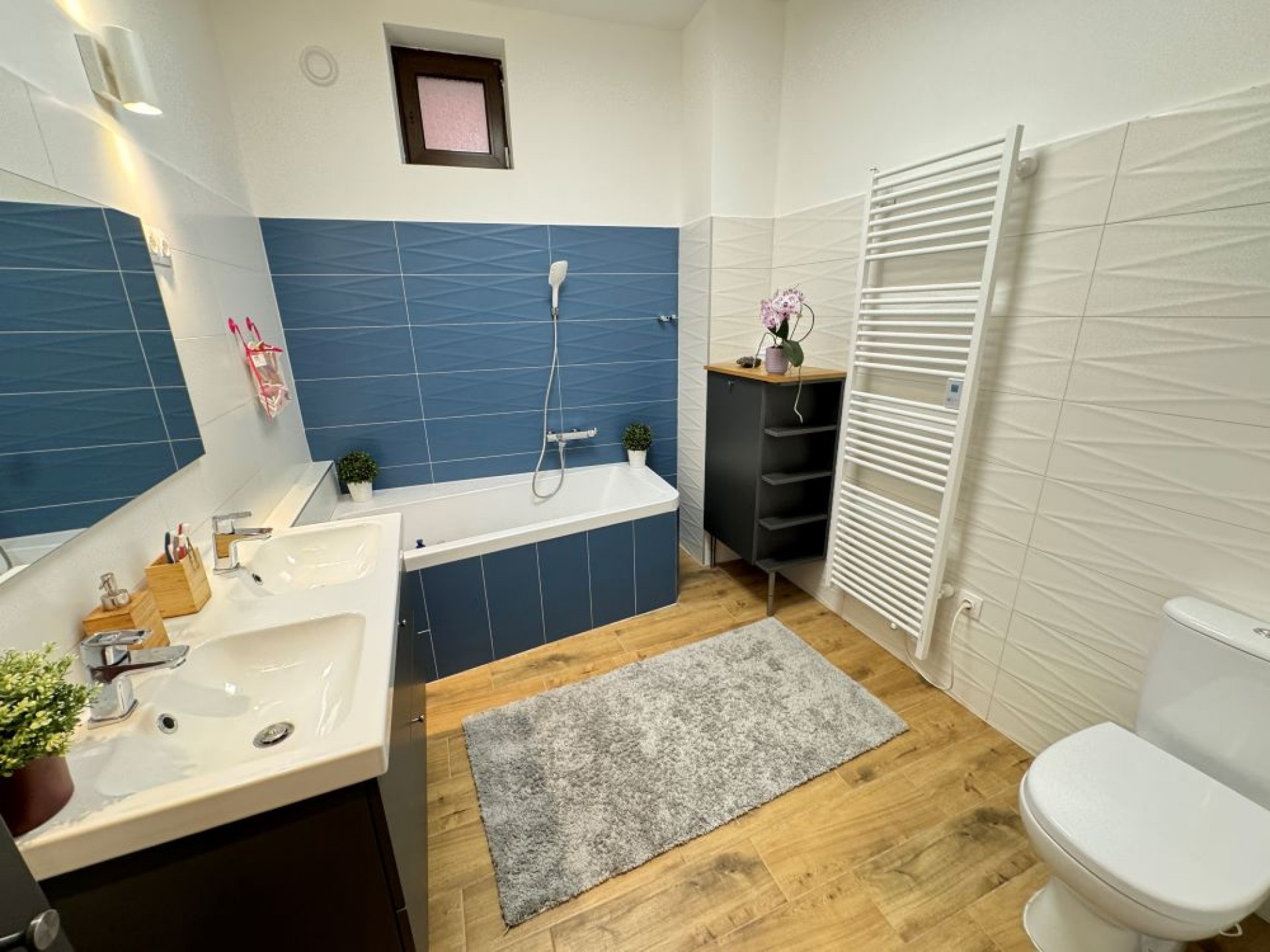 A fűtésről hőszivattyú gondoskodik padlófűtéssel és hűtő-fűtő klímával, emellett az alsó szinten található 2 nagy hálóban mennyezeti fűtés, a babaszobában pedig falfűtés került kialakításra. Az emeleten tavaly beszereltek egy hűtő-fűtő klímát.