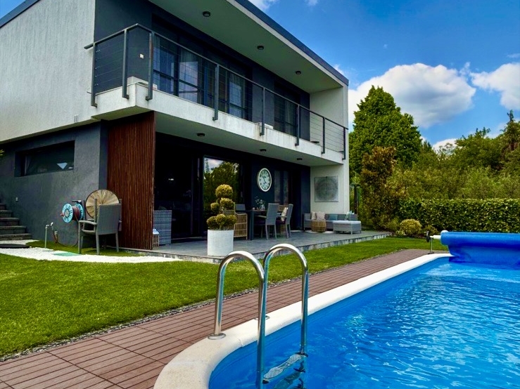 Penthouse hangulatú, minden extrával felszerelt, medencés, panorámás, intelligens luxusház eladó Törökugrató egyik legjobb utcájában