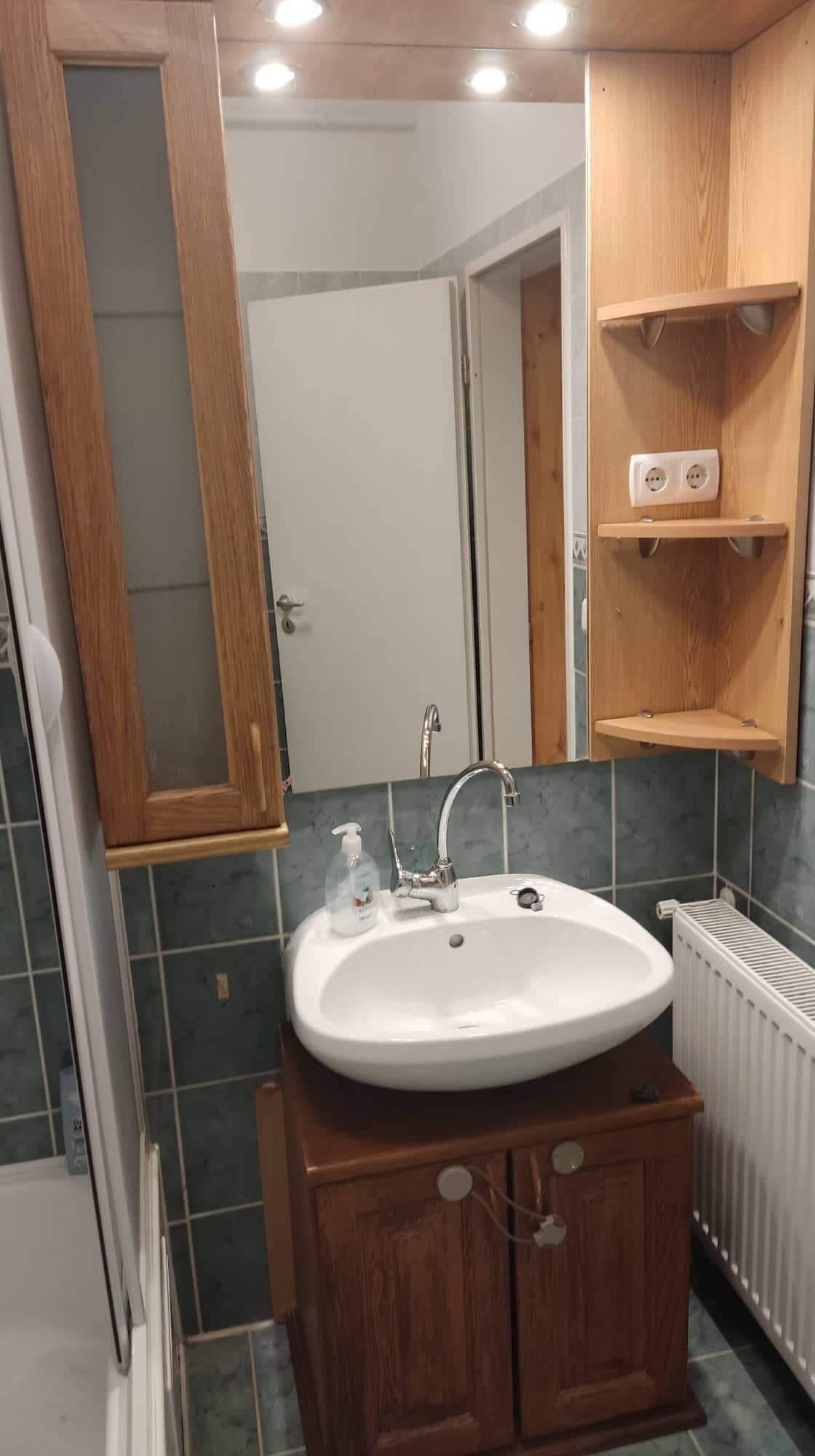 A fürdőszoba zuhanykabinos, mosógéppel. A nappaliban és hálóban nagyméretű gardrob szekrény került beépítésre.