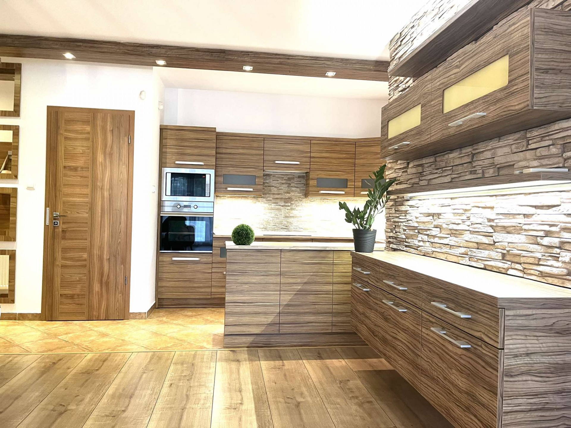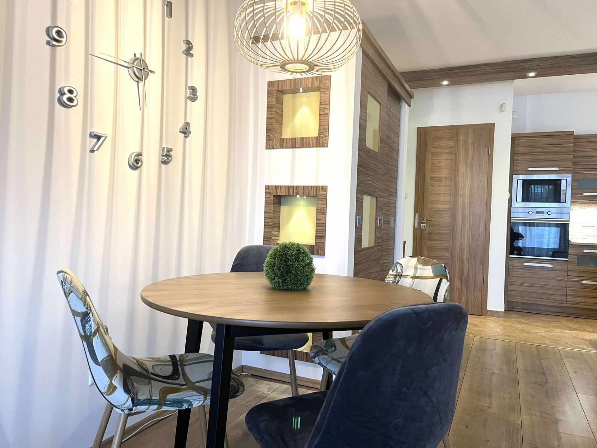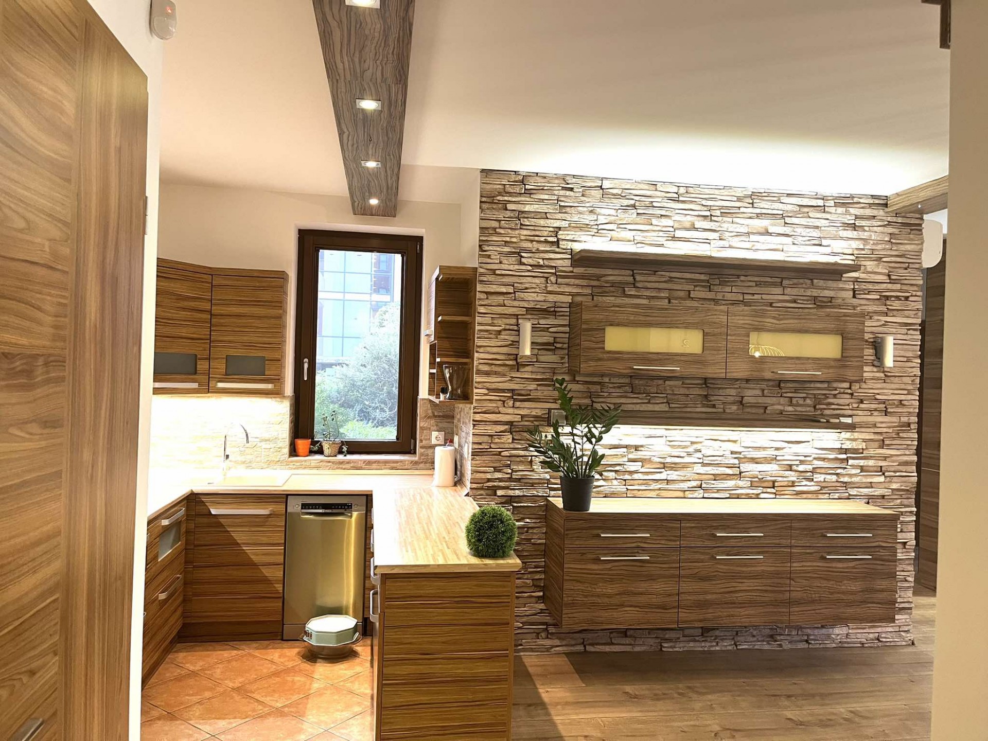 A konyha teljes gépészettel, ( indukciós főzőlap, sütő, mikró, mosogatógép, páraelszívó), kamraszekrénnyel rendelkezik, a fürdőszoba zuhanykabinnal és WC-vel ellátott, a bejáratnál vendég WC is van.