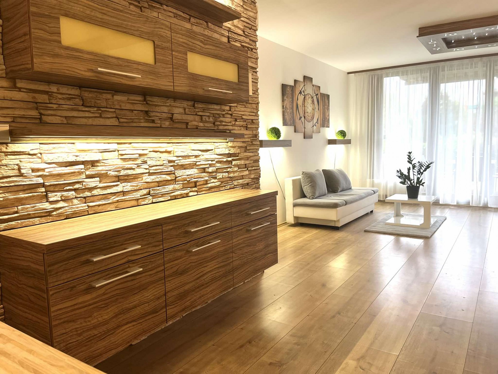 A nappaliban inverteres klíma, távirányítással működtethető hangulatvilágítás fokozza a kényelmet.