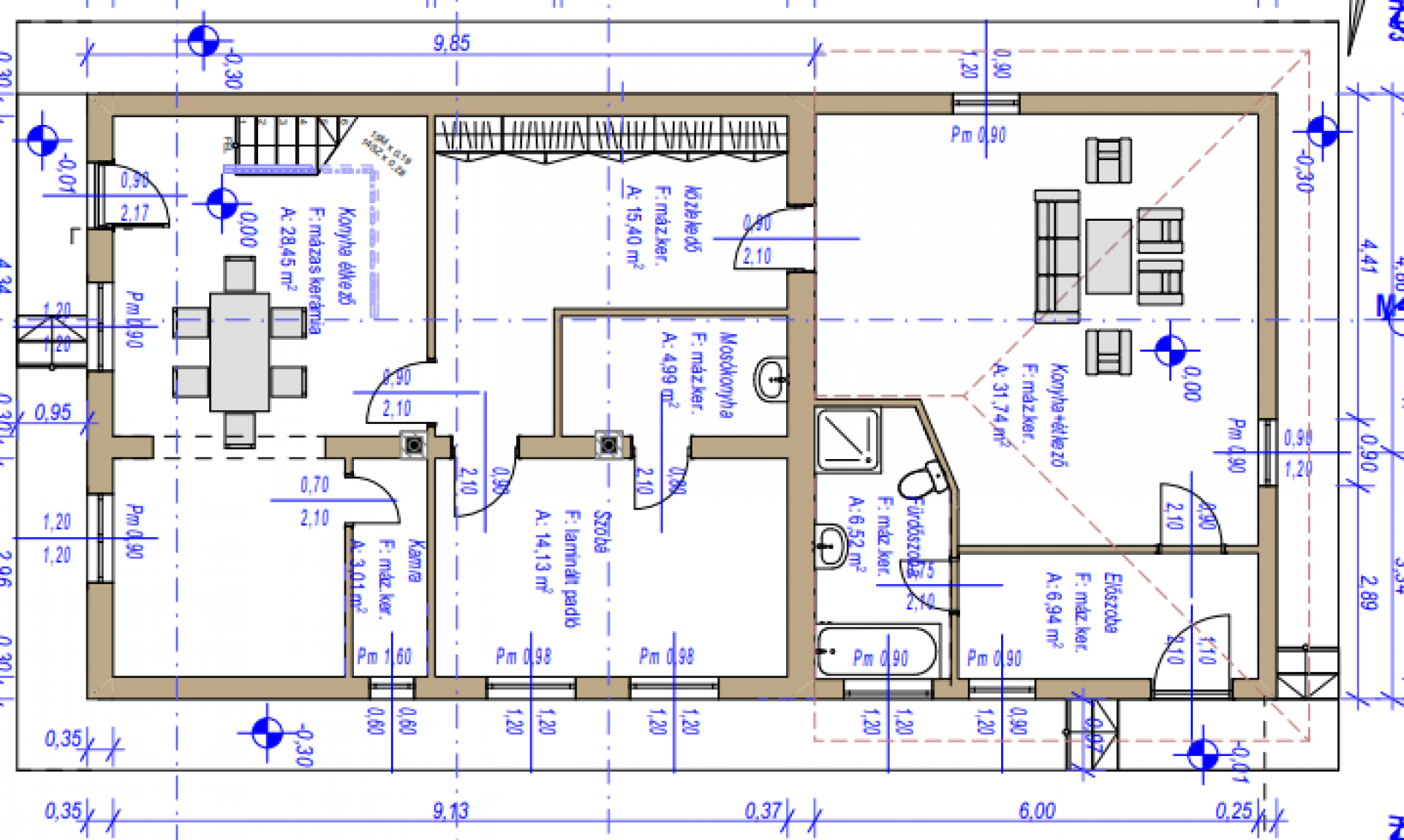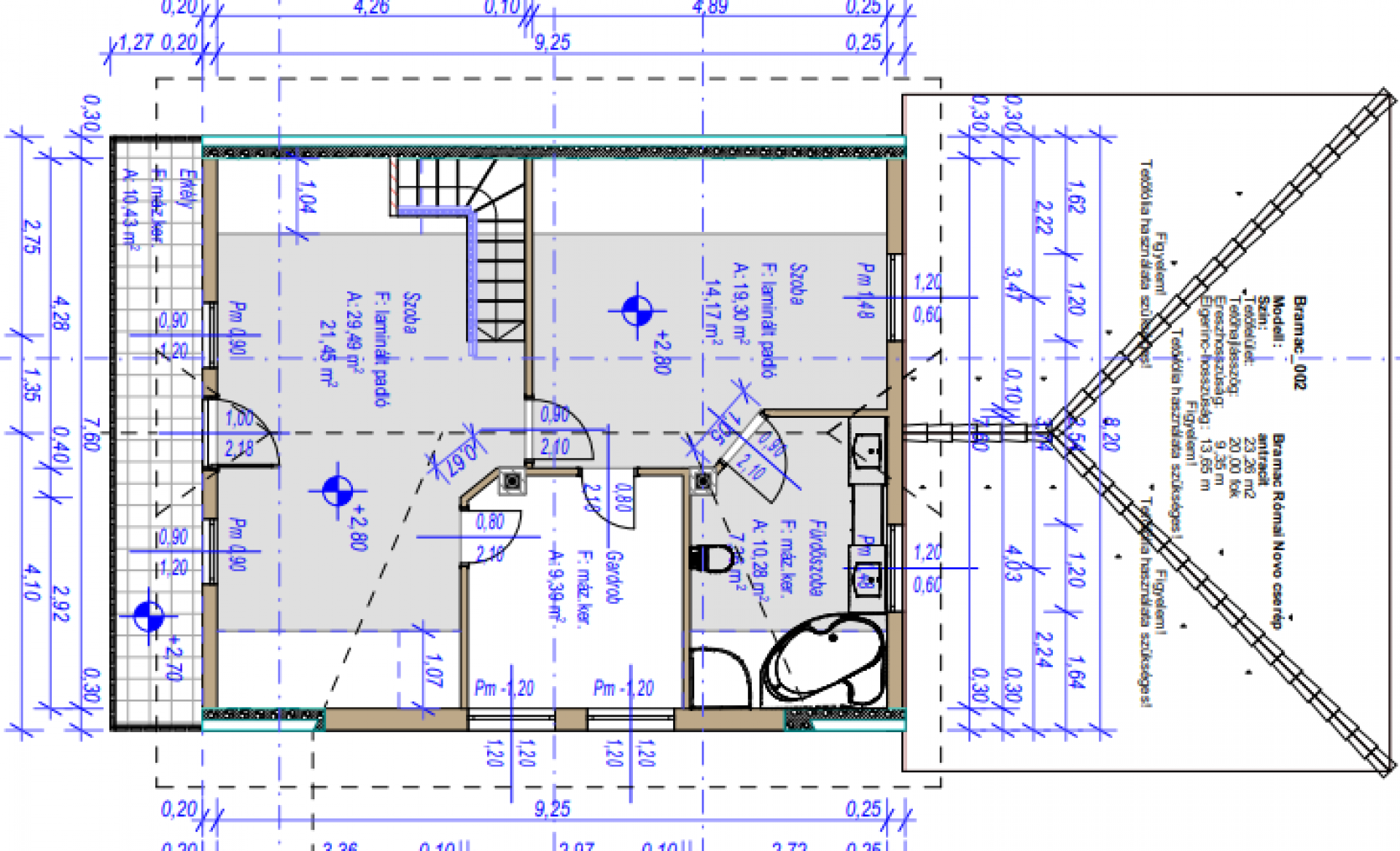 - Az 1. födém beton gerendás, a 2. födém könnyűszerkezetes, 30 cm-es Rockwool szigeteléssel.