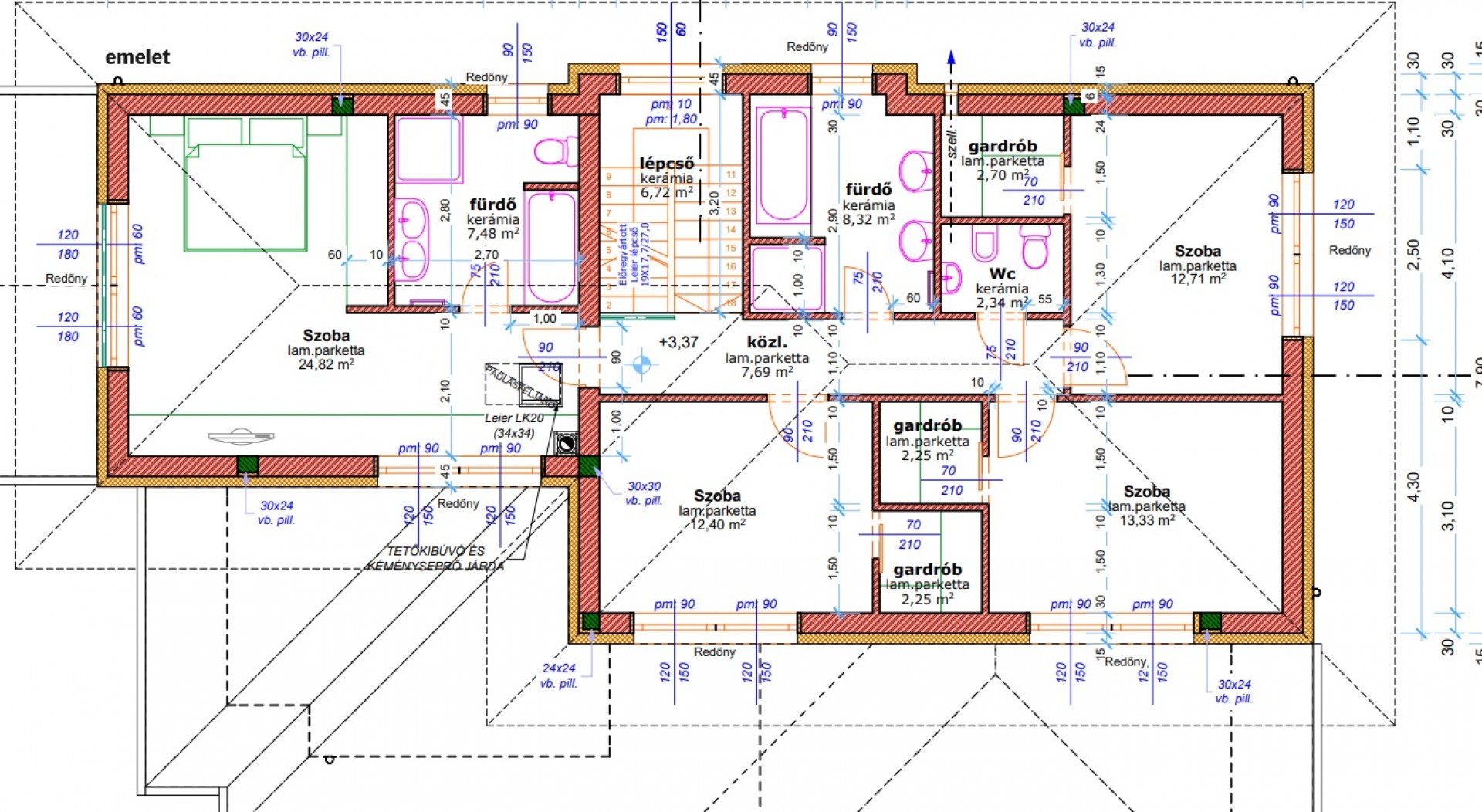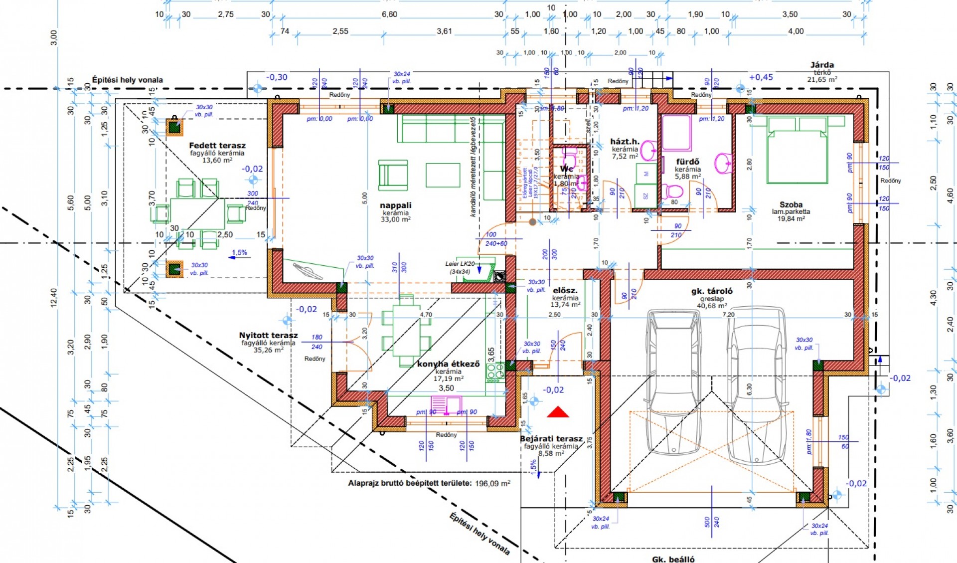 - főfalak: 30cm vastag Porotherm X-therm tégla, 20 cm vastag Dryvit rendszerű hőszigeteléssel