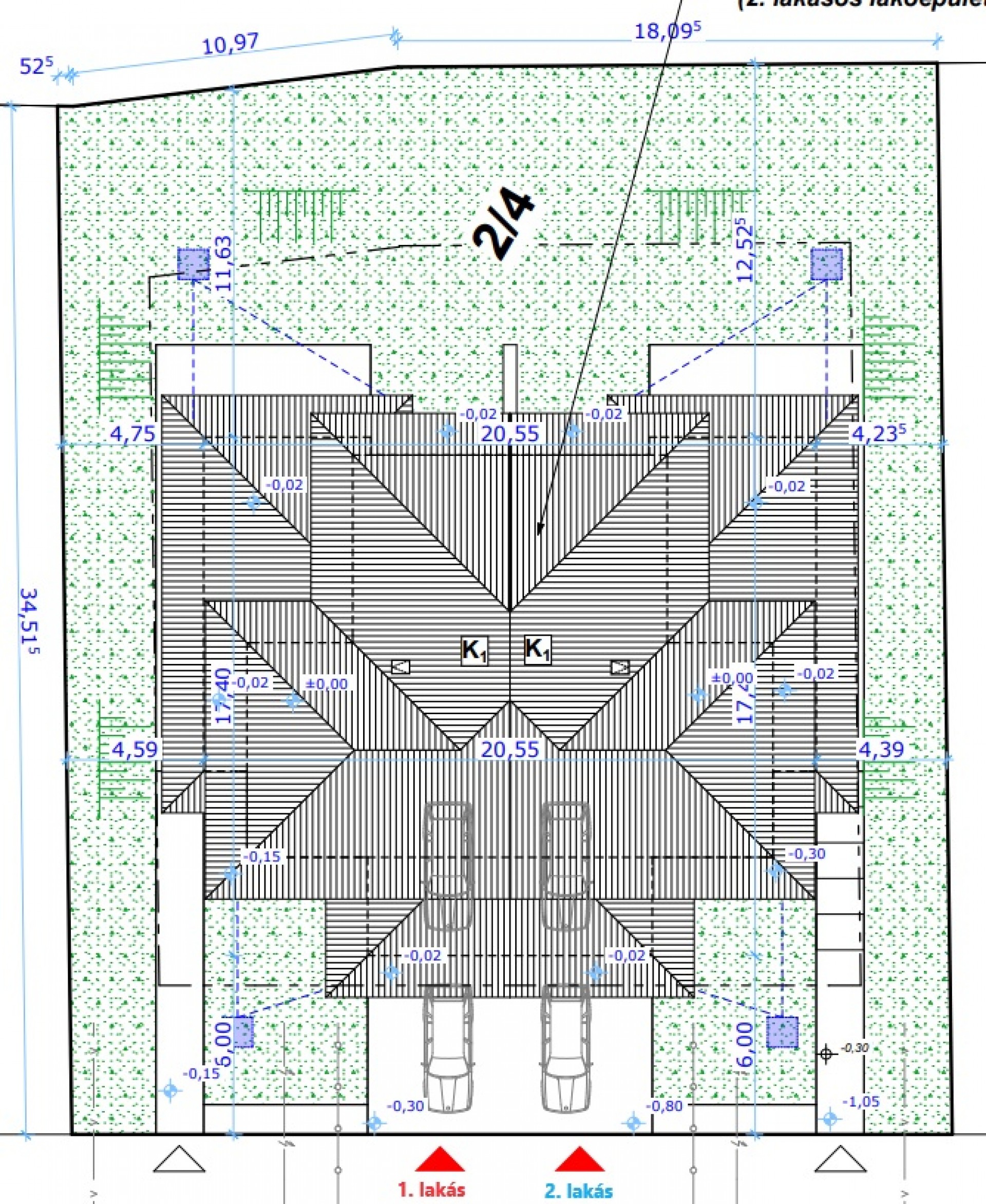 Kétlakásos lakóépület lakásai (10 számmal jelölt ház, 1 számú lakása a helyszínrajzon):