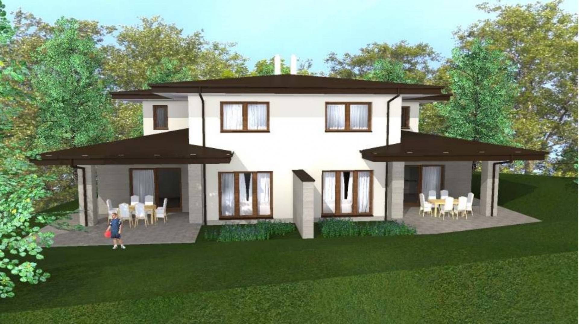 Mindkét lakás 179 m2 alapterületű, 2 szintes, nappali + 4 szobás, 3 fürdőszobás. A lakásokhoz tartozó kert mérete 500 m2 (a teljes telek terület: 1051 m2). Parkolás önálló garázsban lehetséges.