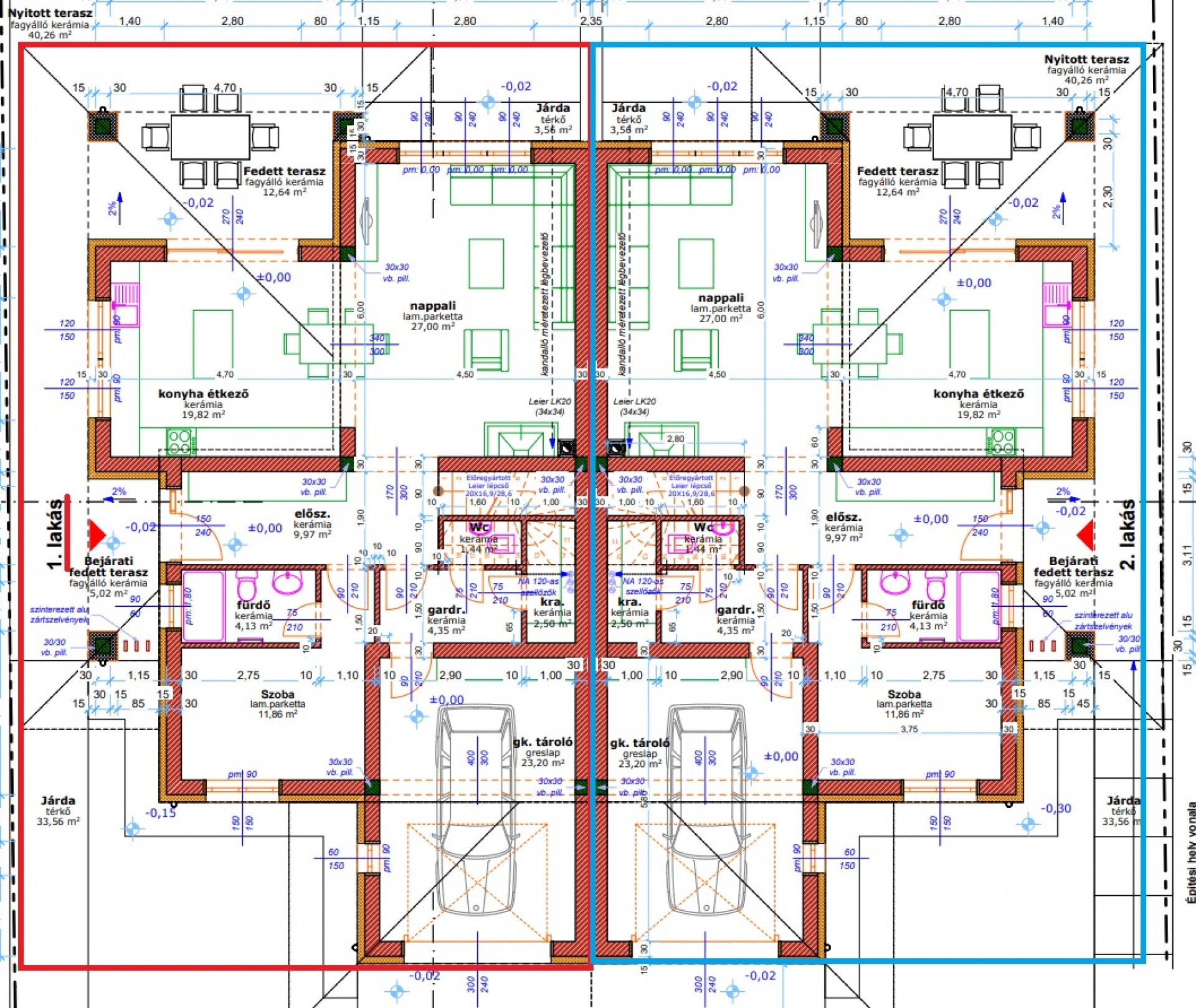 A lakóparkban 5 kétlakásos családi ház kerül megépítésre 1-es és 2-es számozású lakásokkal, melyek egyforma méretűek és egyforma alaprajzzal is rendelkeznek.