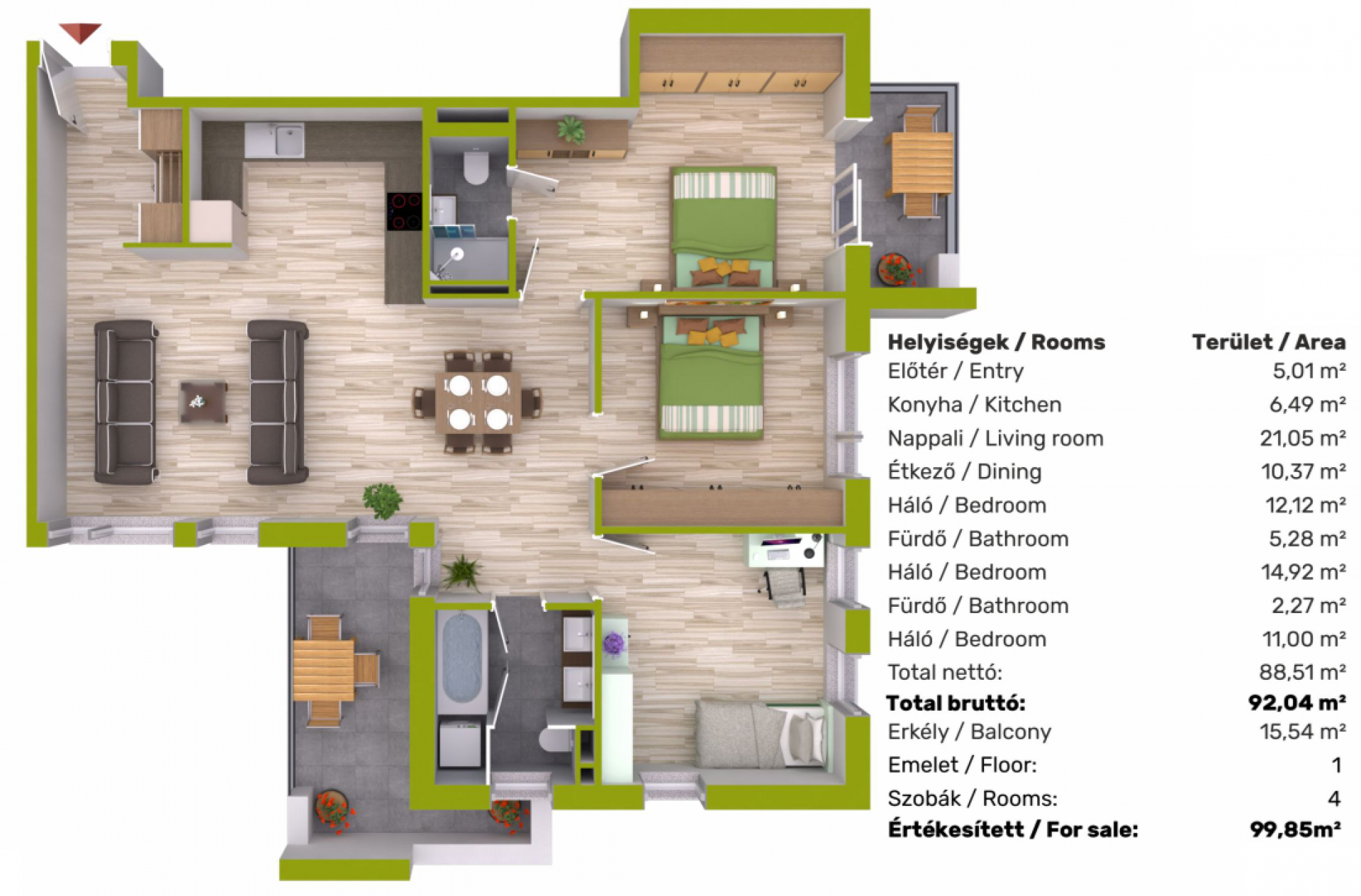 A lakás korszerű műszaki tartalommal készül: hőszivattyús fűtési rendszer, minőségi, modern burkolatok, valamint nagy ablakfelületek biztosítják a világos és kellemes életteret. Az átgondolt alaprajzi kialakításnak köszönhetően tágas, élhető méretű szobák jönnek létre, miközben az energiahatékony megoldásoknak köszönhetően alacsony fenntartási költség várható. A 15,54 m²-es erkély további kültéri teret biztosít pihenéshez, étkezéshez vagy egy nyugodt reggeli kávéhoz.