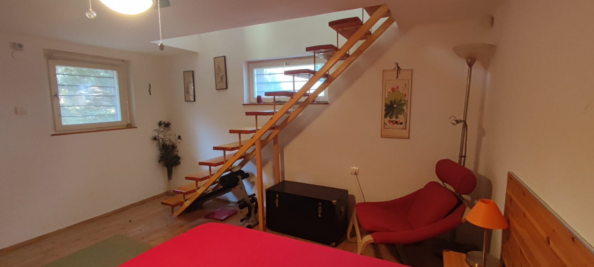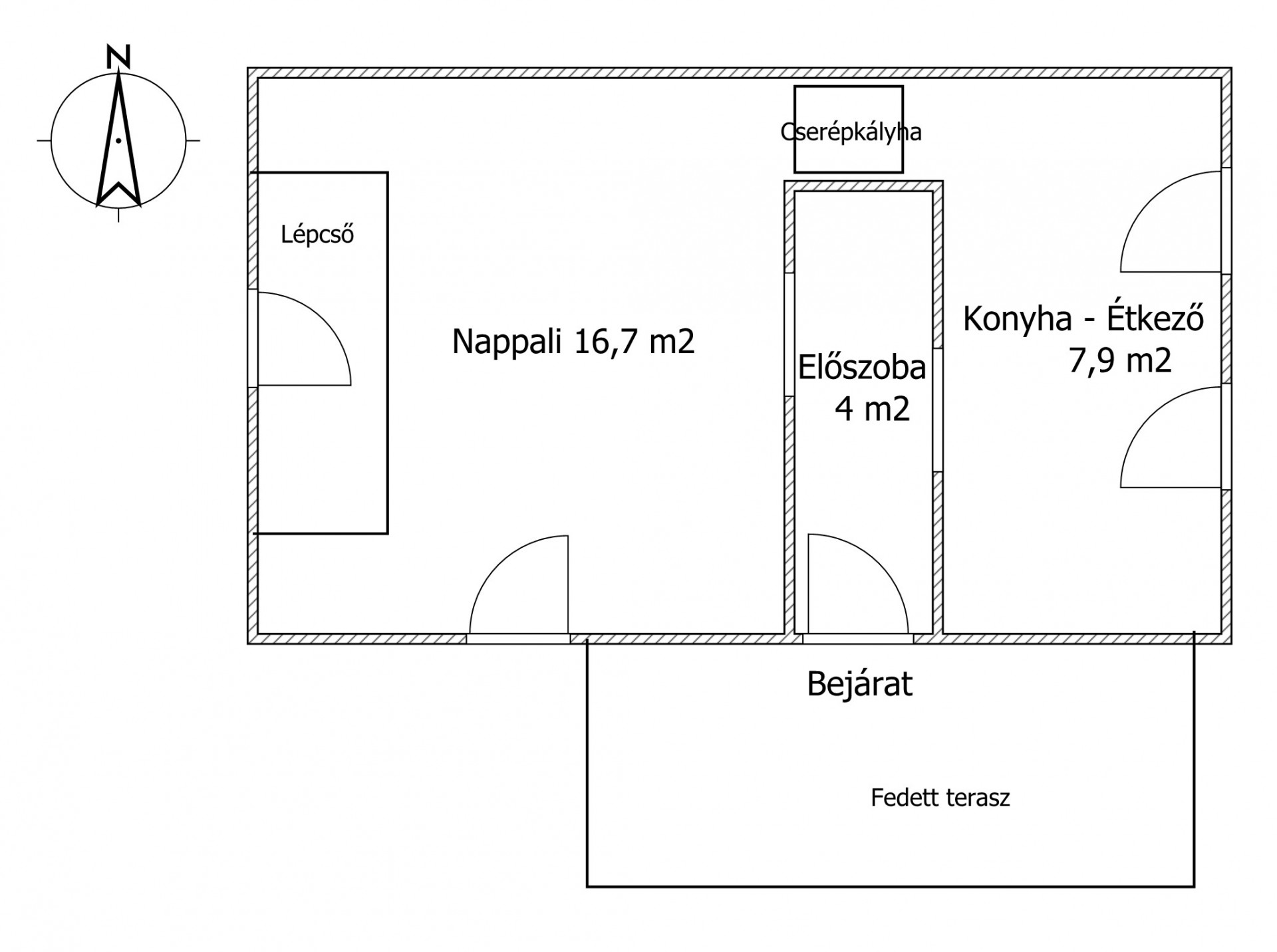 Az 1082m2-es telken egy ingatlan található 60m2 hasznos alapterülettel. A domboldali telek adottsága miatt a ház félszuterén és földszintes kialakítású. A bejáraton keresztül a földszinten található előszobába érkezünk, jobbra található a konyha és az étkező, balra pedig a nappali szoba. A nappali szobából egy lépcsőn keresztül jutunk a félszuterén részbe, ahol a hálószoba, a kádas fürdőszoba és egy gardrób található. A földszint belmagassága 2,58 méter a félszuterén pedig 2,12 méter. Mind a két szint 30 m2 alapterületű.