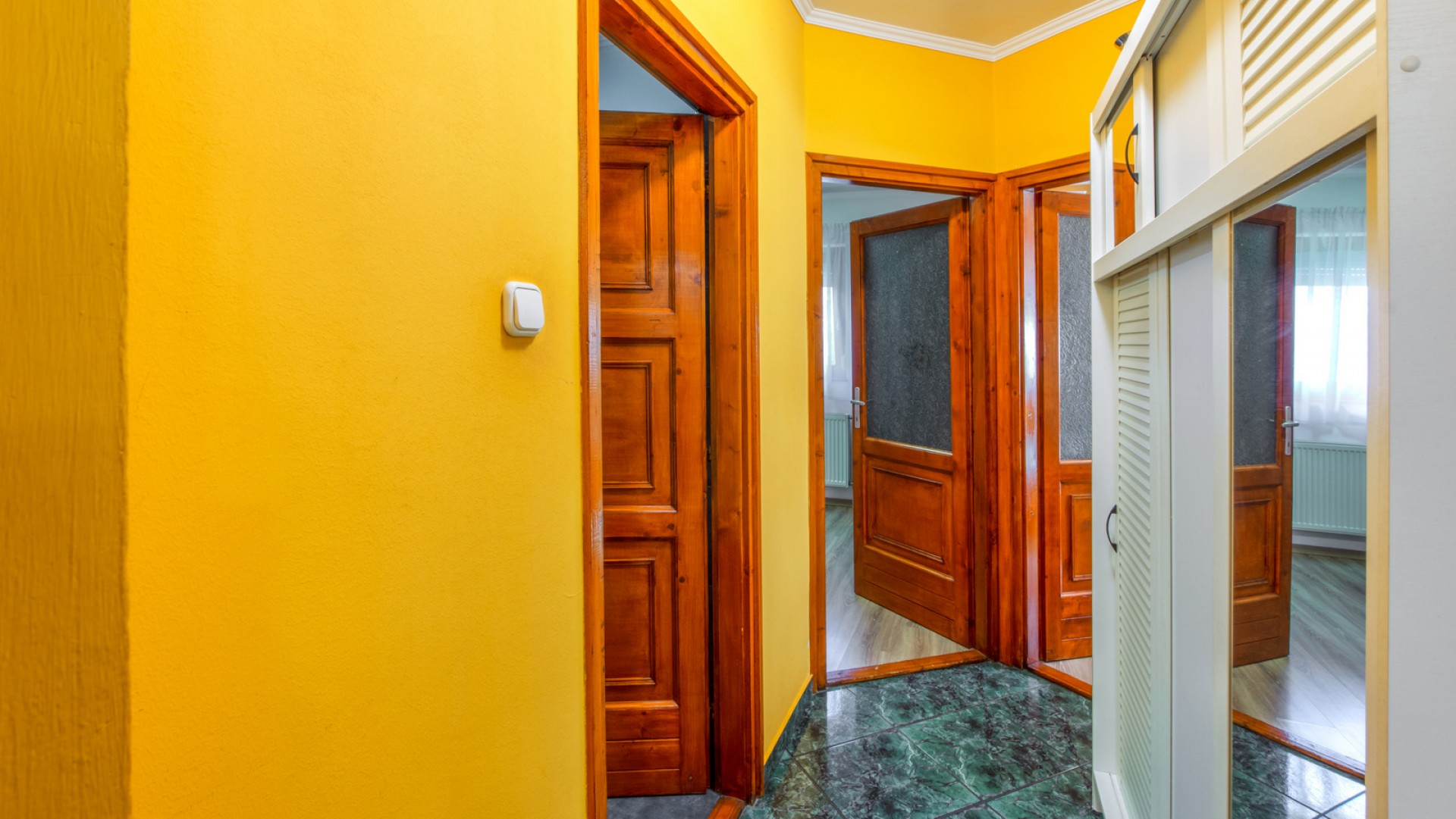A nyílászárók fa thermo üvegesek, redőnnyel felszerelve. A burkolatok: 2 szoba laminált parkettás, 1 szoba padlószőnyeges, a többi helyiség járólappal burkolt.