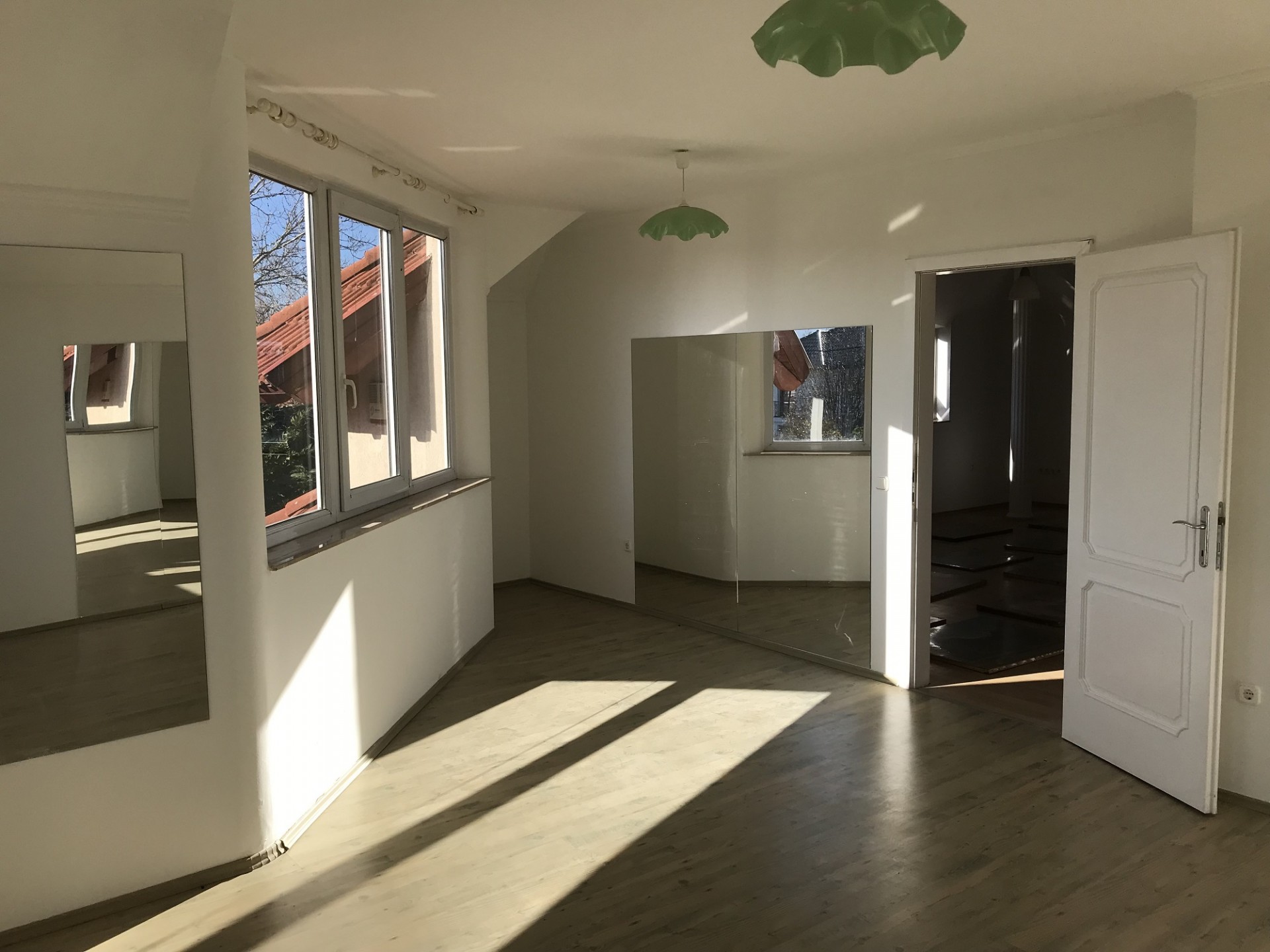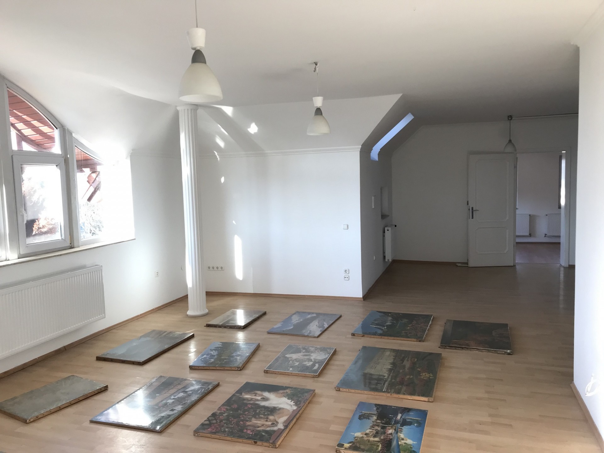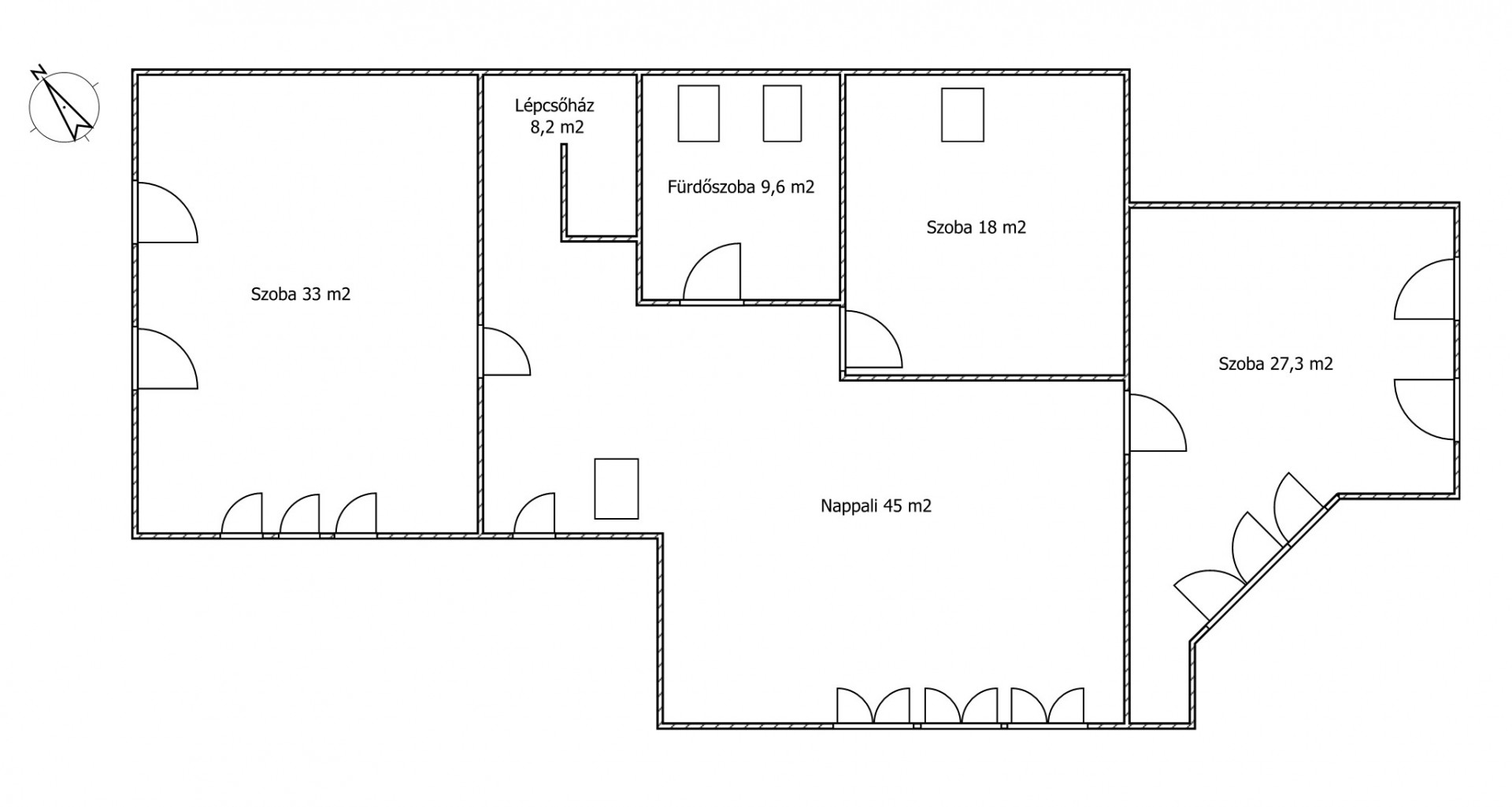 Az emeleten van három szoba, ami egyenként 33, 27 és 18m2-es, továbbá itt is található egy nappali szoba, ami 45m2 illetve a fürdőszoba, ami 9,6m2-es.