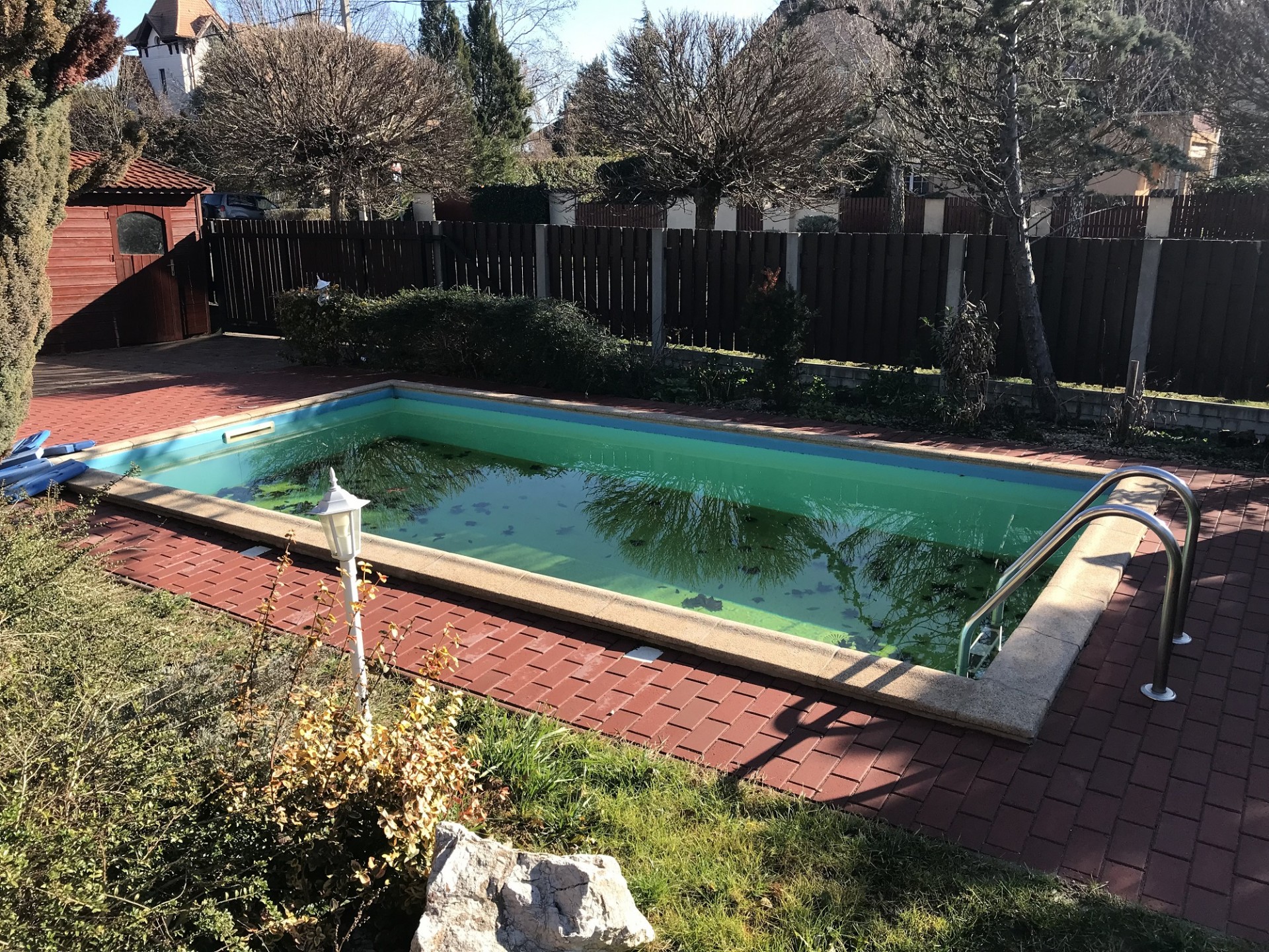 A telek 800 m2-es füvesített, fákkal és bokrokkal ültetett, itt kapott helyet a 6x3 méteres kültéri medence is.