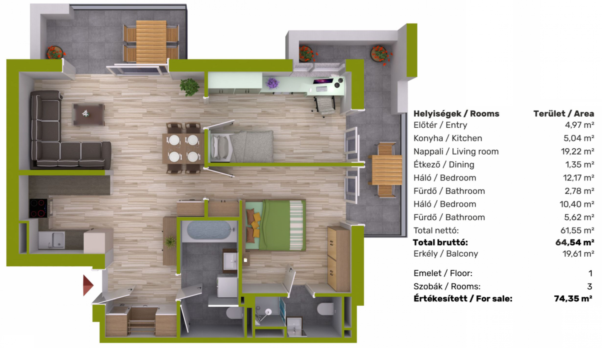 Lakás alapterülete: 64,54 m²