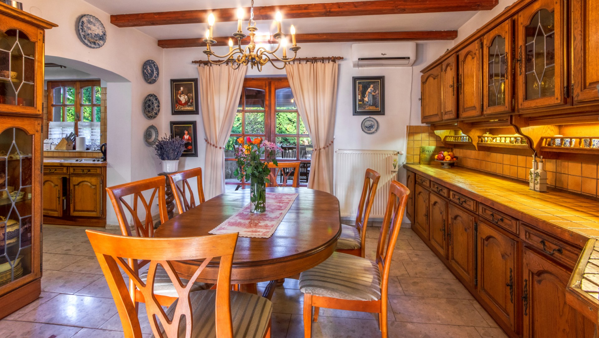 - Konyha & étkező: francia Bonard stílusú fa konyhaszekrénnyel és tálalóval