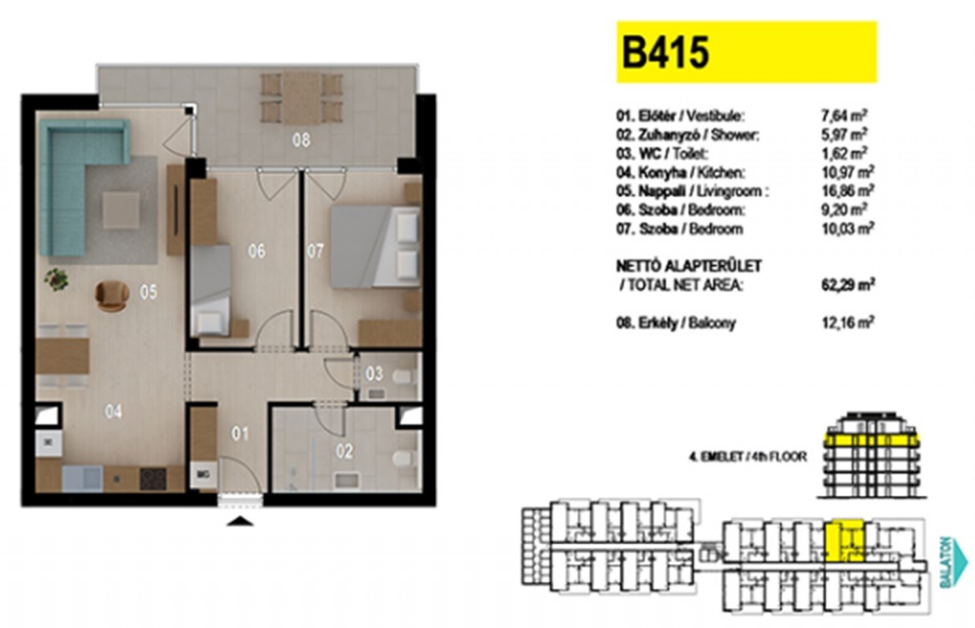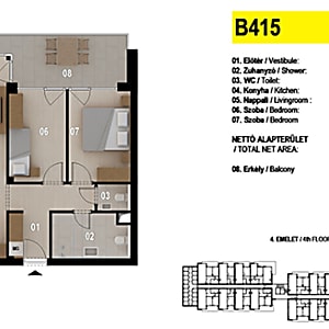 A nappali és 2 hálószobás lakás nettó 63 nm-es, 12 nm-es terasszal, fürdőszobával, 2 WC-vel.