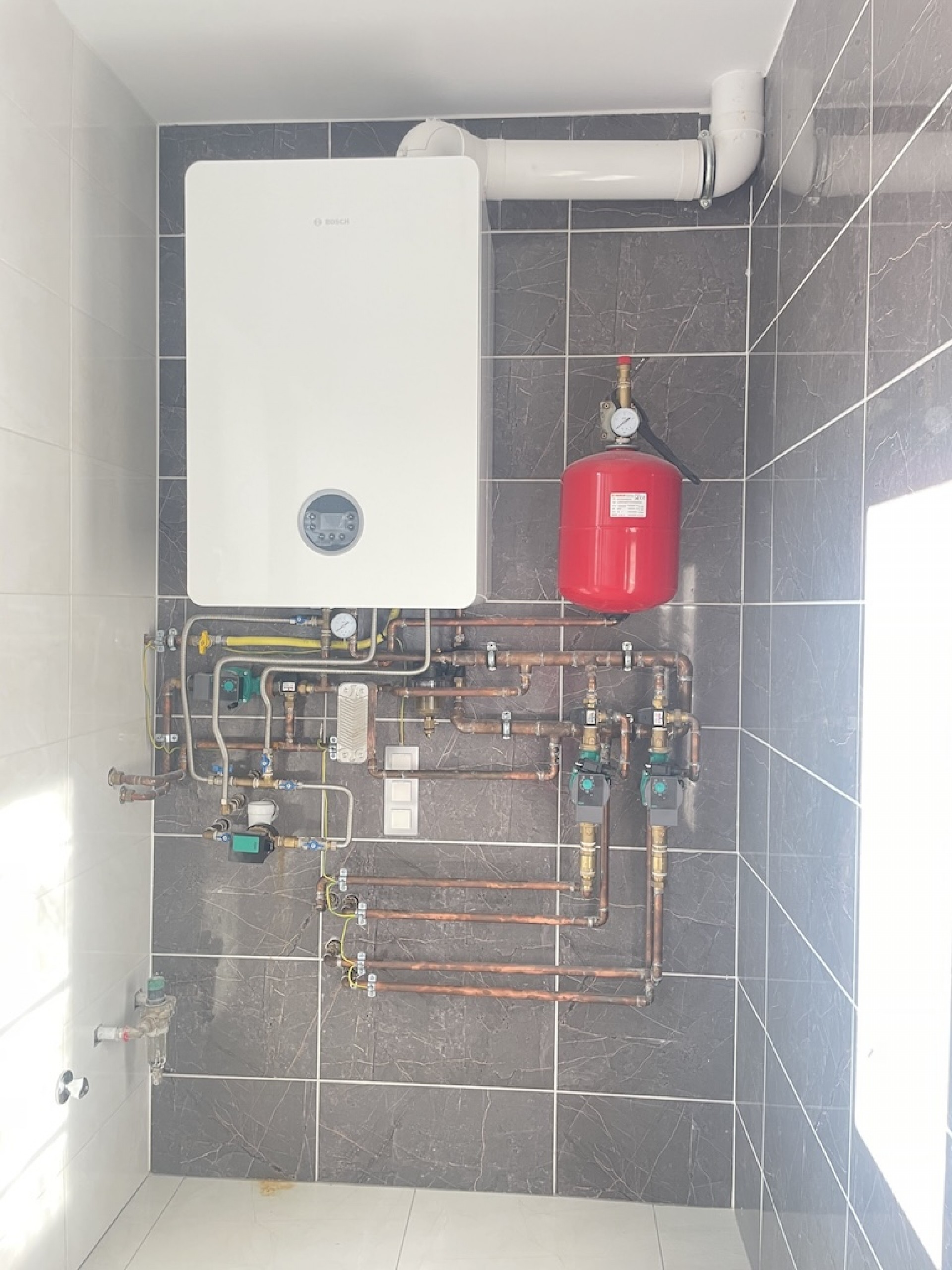 Bosch cirkófűtés padlófűtéssel minden helyiségben, fürdőkben törölközőszárító radiátorral