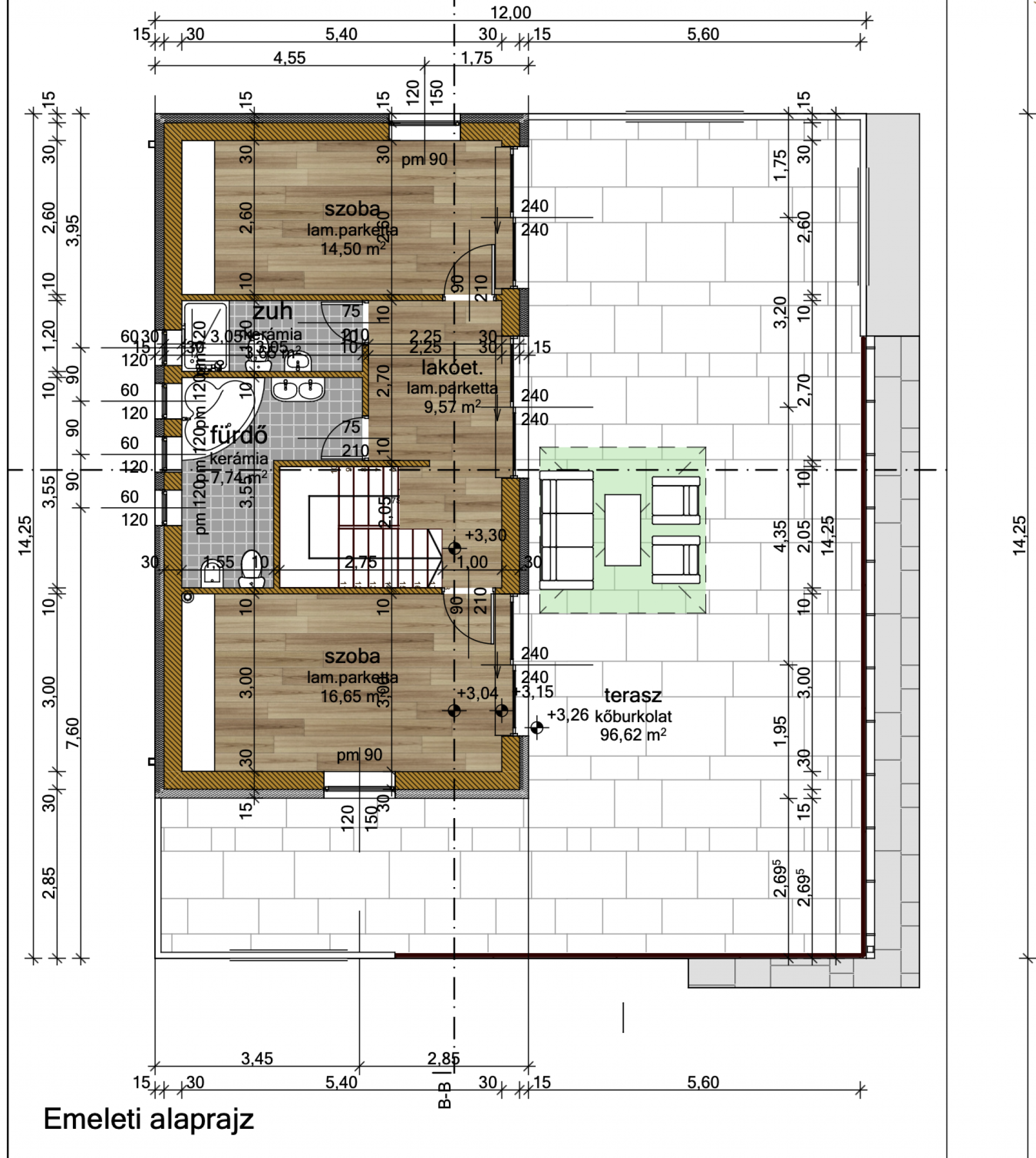 Emelet (52,11 m2 + 96,62 m2-es terasz!) teljesértékű belmagasság!