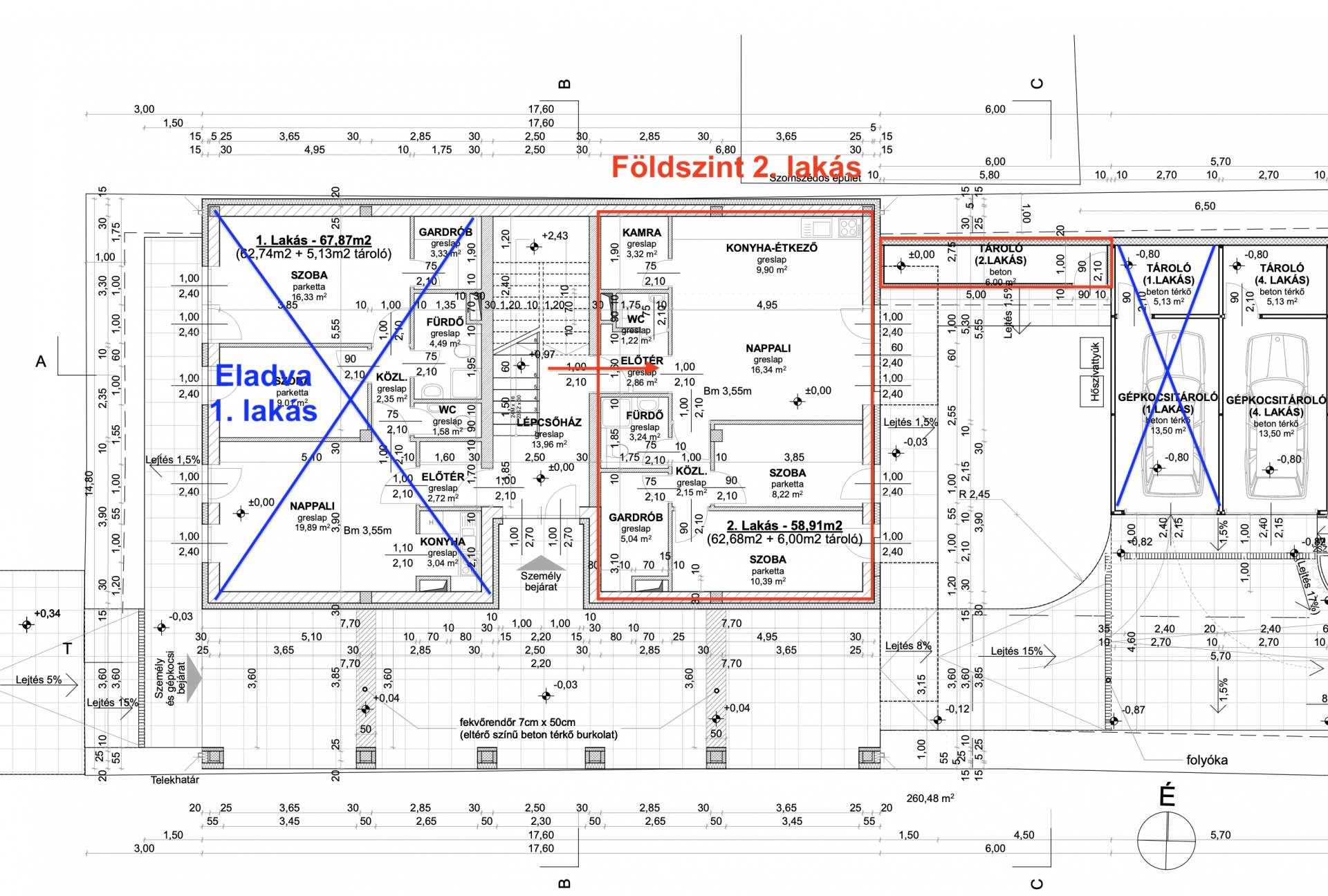 4. akás – alapterület 60,70 m2, nappali + 2 szoba. Ára 76,99 M. Tároló 5,13 m2. Ára 2 M + garázs 13,5 m2. Ára: 3 M