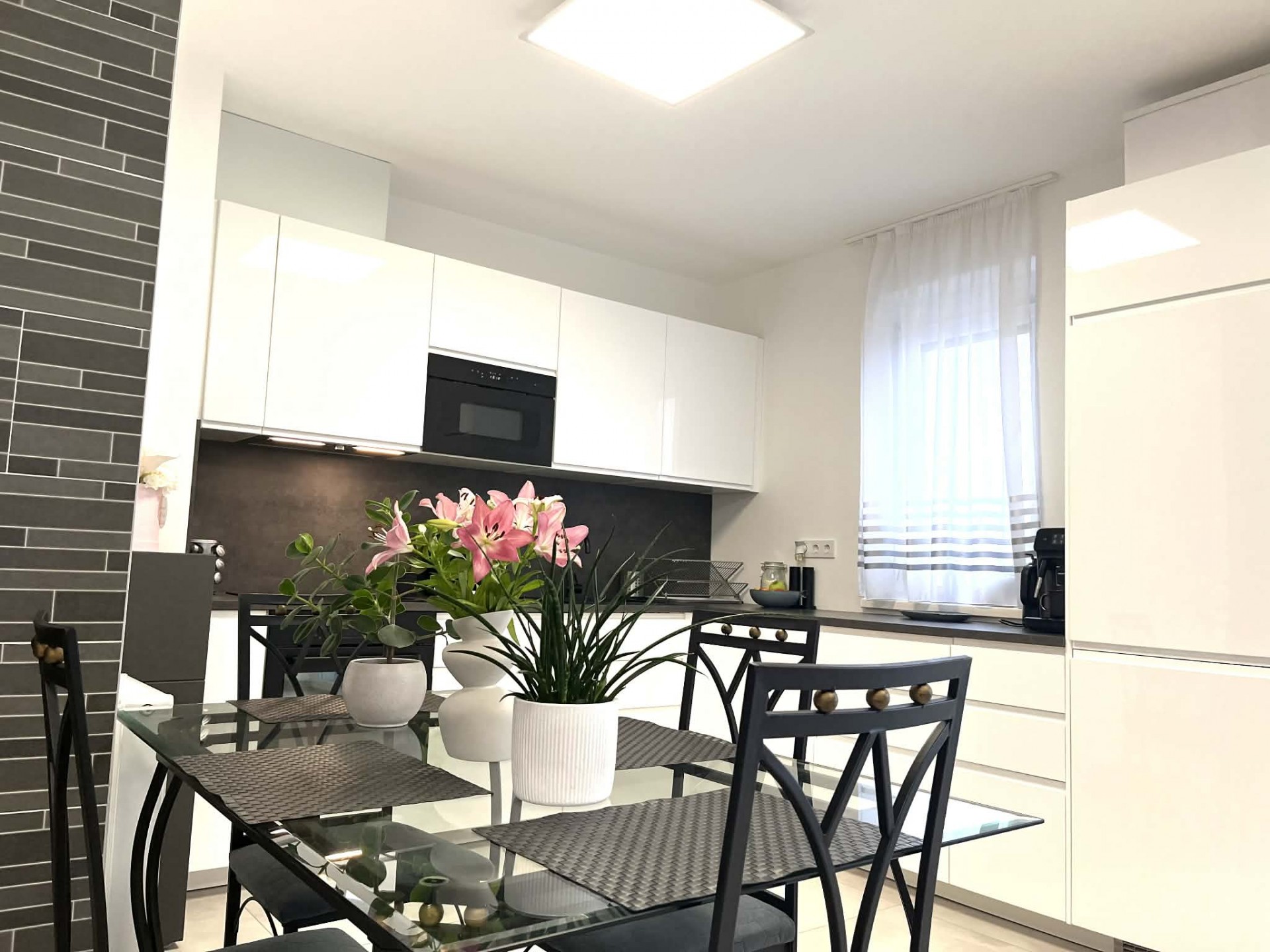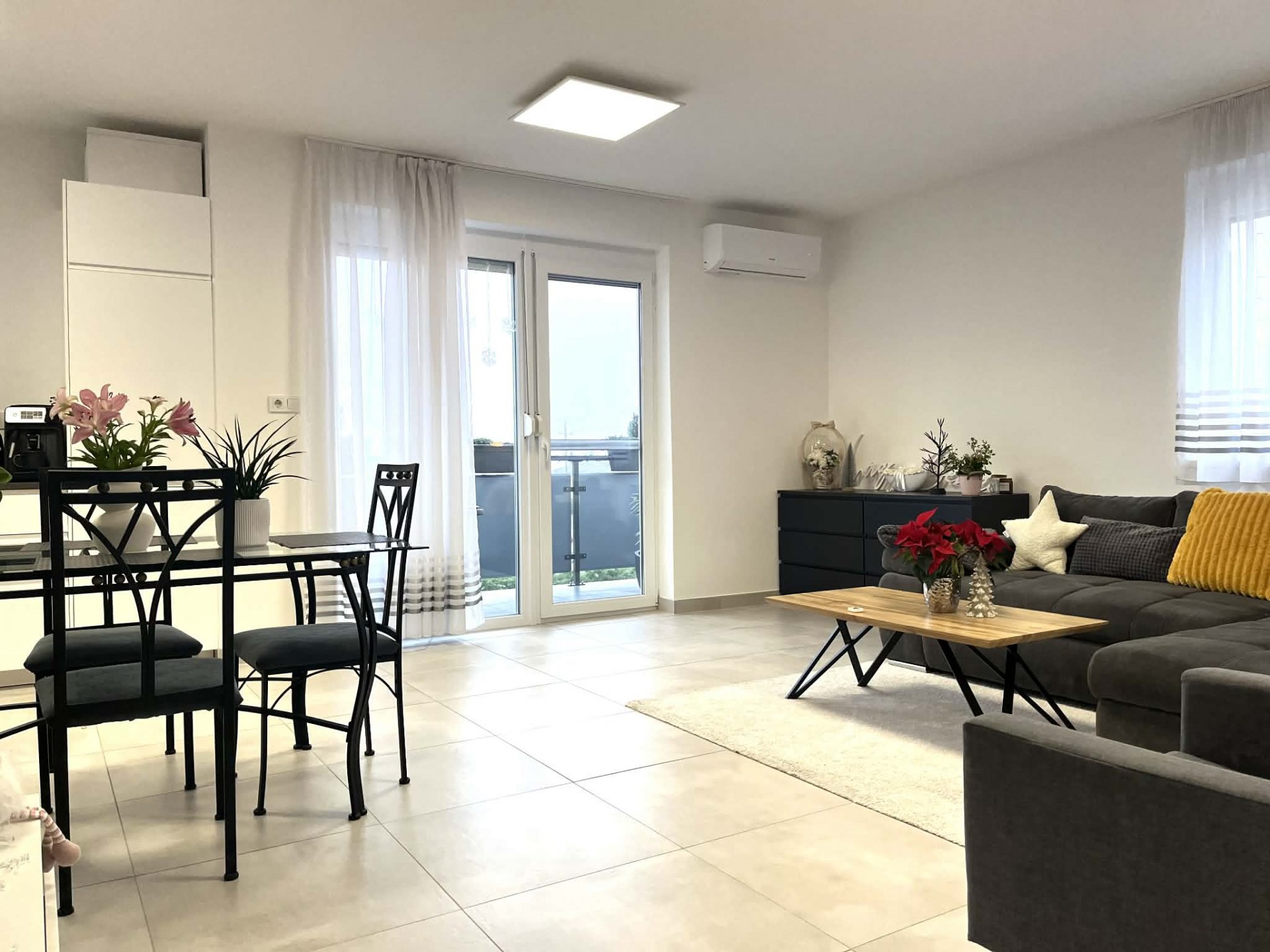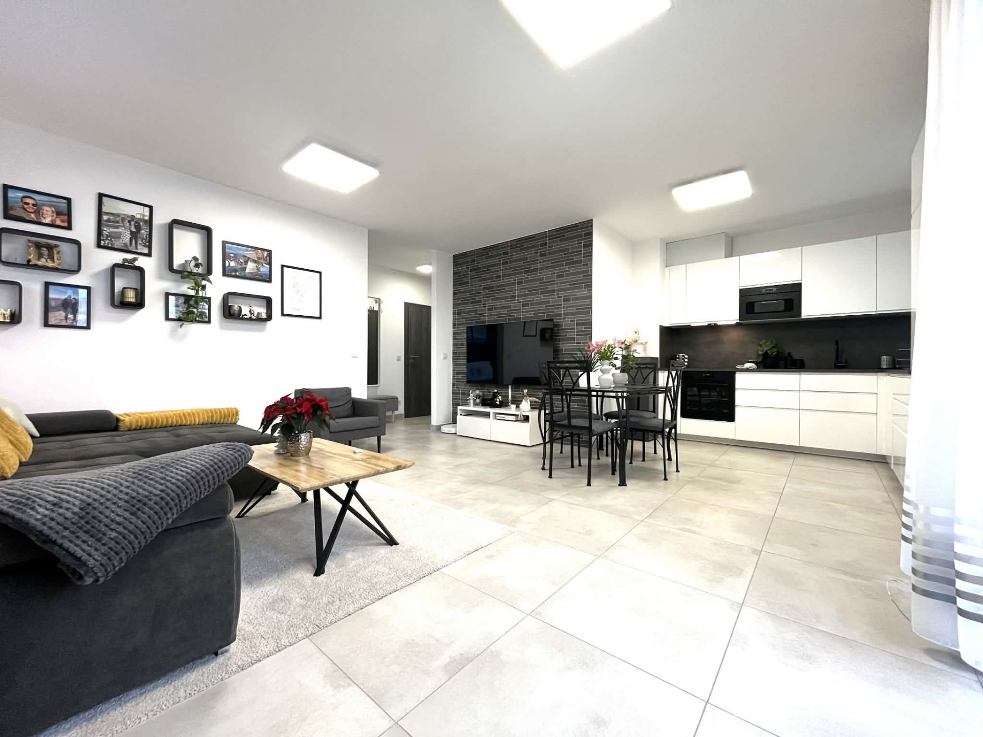 A konyha modern bútorzattal és teljes gépészettel az ár részét képezi. A déli fekvésű nappalihoz 7 nm-es terasz kapcsolódik. A TV mögötti fal kővel burkolt, fokozva a hangulatot.