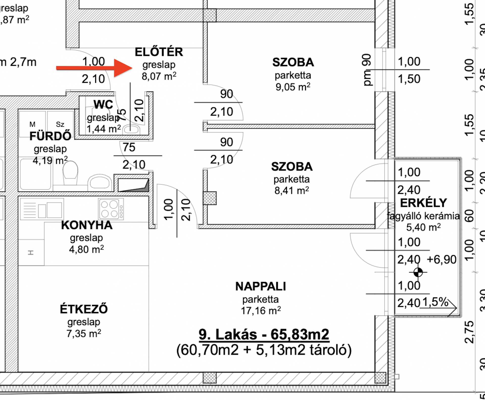Helyiségek: közlekedő 8.07 m2, nappali - konyha - étkező (17.16 m2, 7.35 m2, 4.8 m2), 2 szoba (9.05m2, 8.41m2), fürdőszoba + wc 4.19 m2, wc 1.44m2,