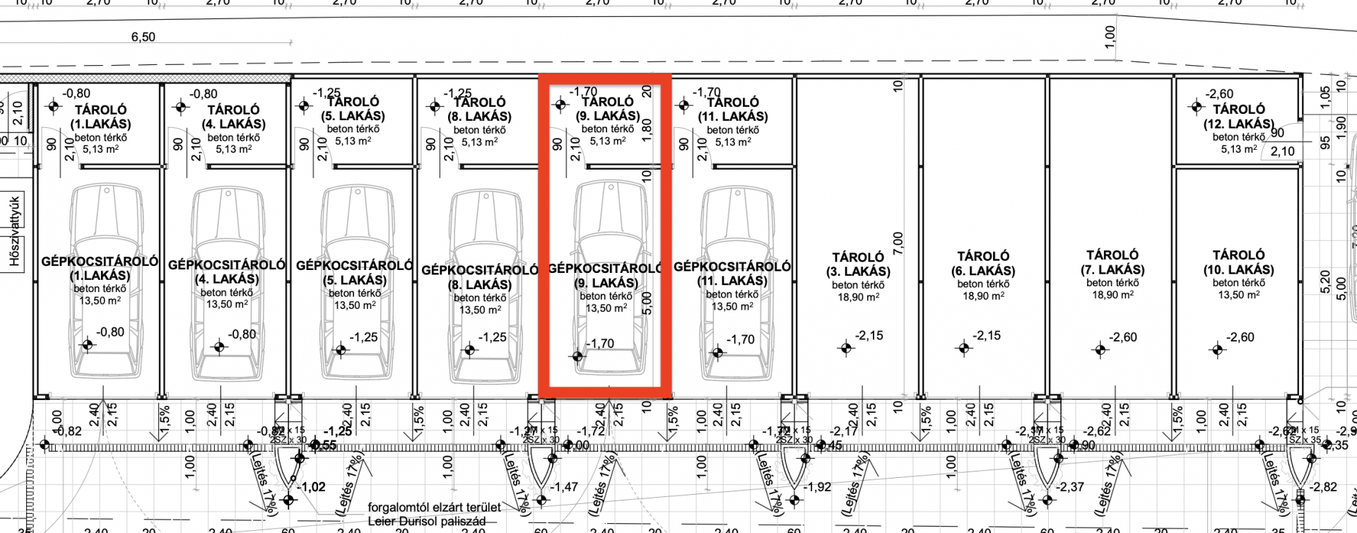 Második emelet 8. lakás - alapterület 60,70 m2, nappali + 2 szoba. Ára 75,99 M. Tároló 5,13 m2. Ára 2 M + garázs 13,5 m2. Ára: 3 M