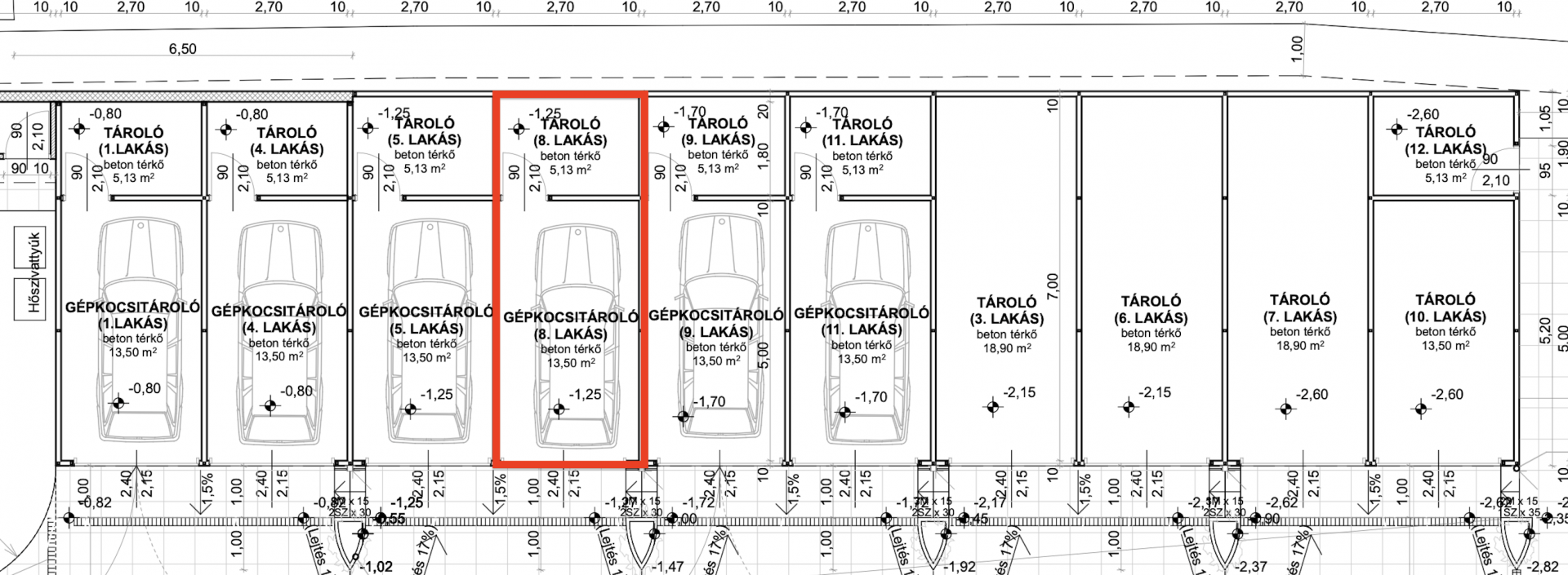 Második emelet 8. lakás - alapterület 60,70 m2, nappali + 2 szoba. Ára 75,99 M. Tároló 5,13 m2. Ára 2 M + garázs 13,5 m2. Ára: 3 M
