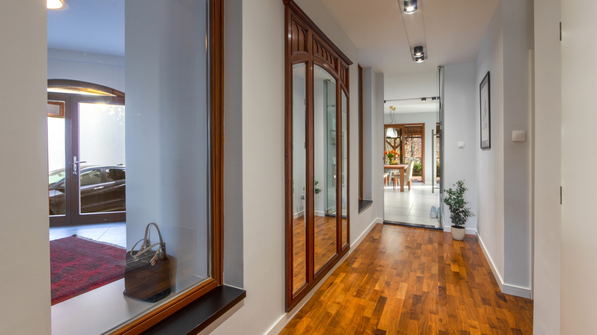 Az impozáns előszoba padlótól plafonig érő üvegfelületeivel és nagyméretű beépített gardróbszekrényeivel már az első pillanatban lenyűgöző.