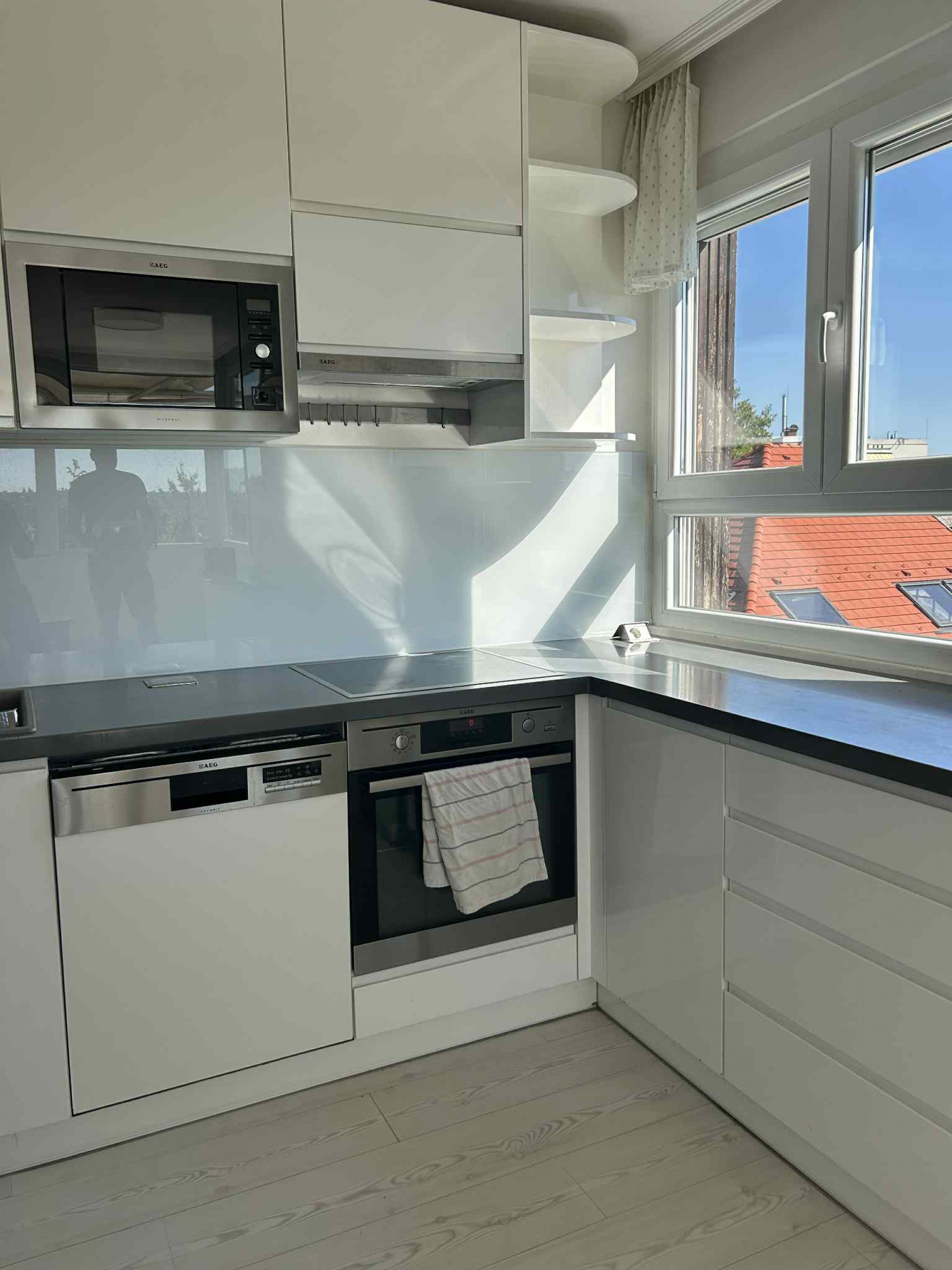 A nagy ablakoknak és a terasznak köszönhetően a lakás egész nap fényárban úszik, a környék pedig biztonságos és forgalomtól mentes.