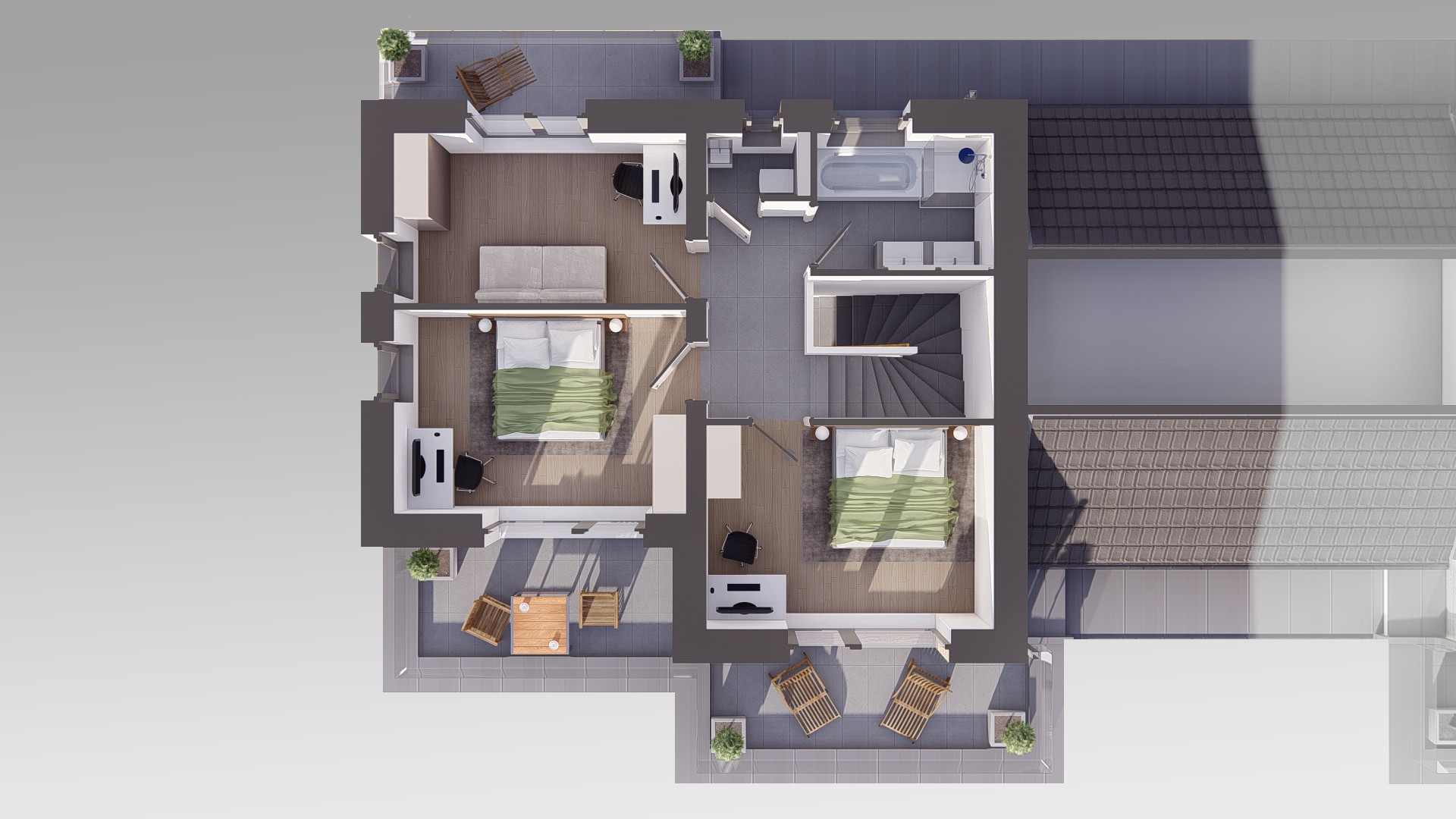 *Emelet (47,78 m² + 23 m² tetőterasz)* - 3 világos hálószoba, mindegyik saját
