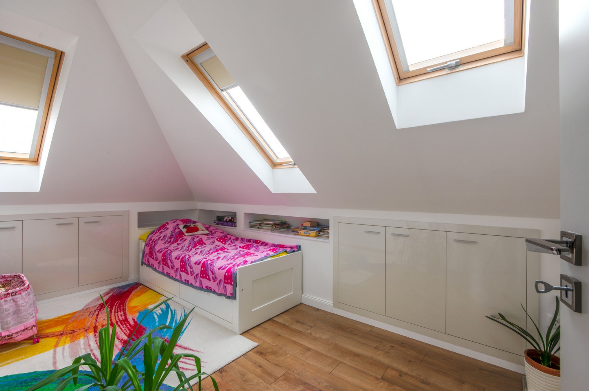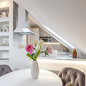 Vadonatúj, gépesített konyhabútor és modern, dizájn burkolatok mindenhol. Méretre készített letisztult megjelenésű beépített szekrények biztosítanak rengeteg tárolóhelyet minden helyiségben. A nappaliban igényes, egyedileg tervezett, térbe komponált gipszkarton polcrendszerek, falfülkék és süllyesztett TV-fal került kialakításra.