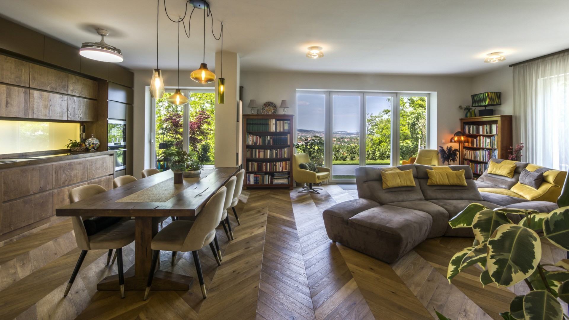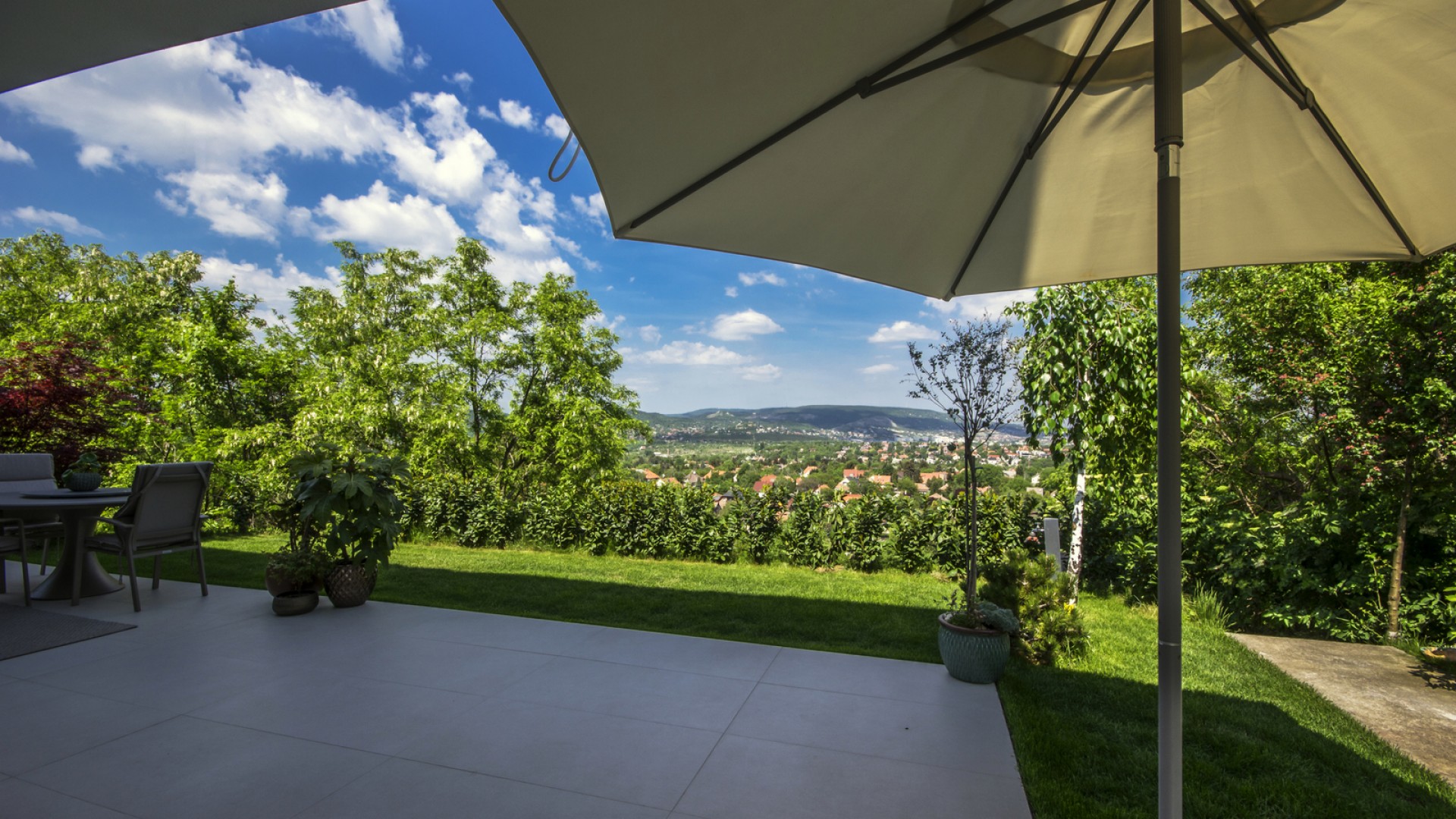 A nappali, konyha étkező egység teljes hosszában kertkapcsolatos, budaörsi hegyekre és Budapestre néző kilátással.