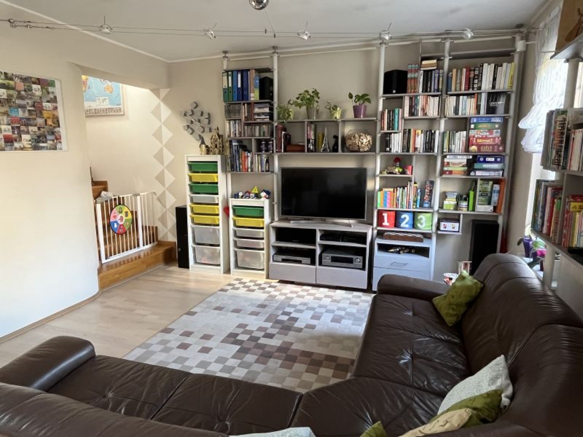 A középső szinten zajlik a családi élet, itt kapott helyet, a főbejárat amely az előszobába nyílik, egy világos, szeparált konyha - étkező, és nappali valamint mellékhelyiség. A kert, amely kizárólagos használatú, erről a szintről elérhető, burkolt terasz és a gyerekeknek játszósarok is kialakított. Szépen karbantartott és parkosított növényzettel beültetett, kerti sütögetővel.