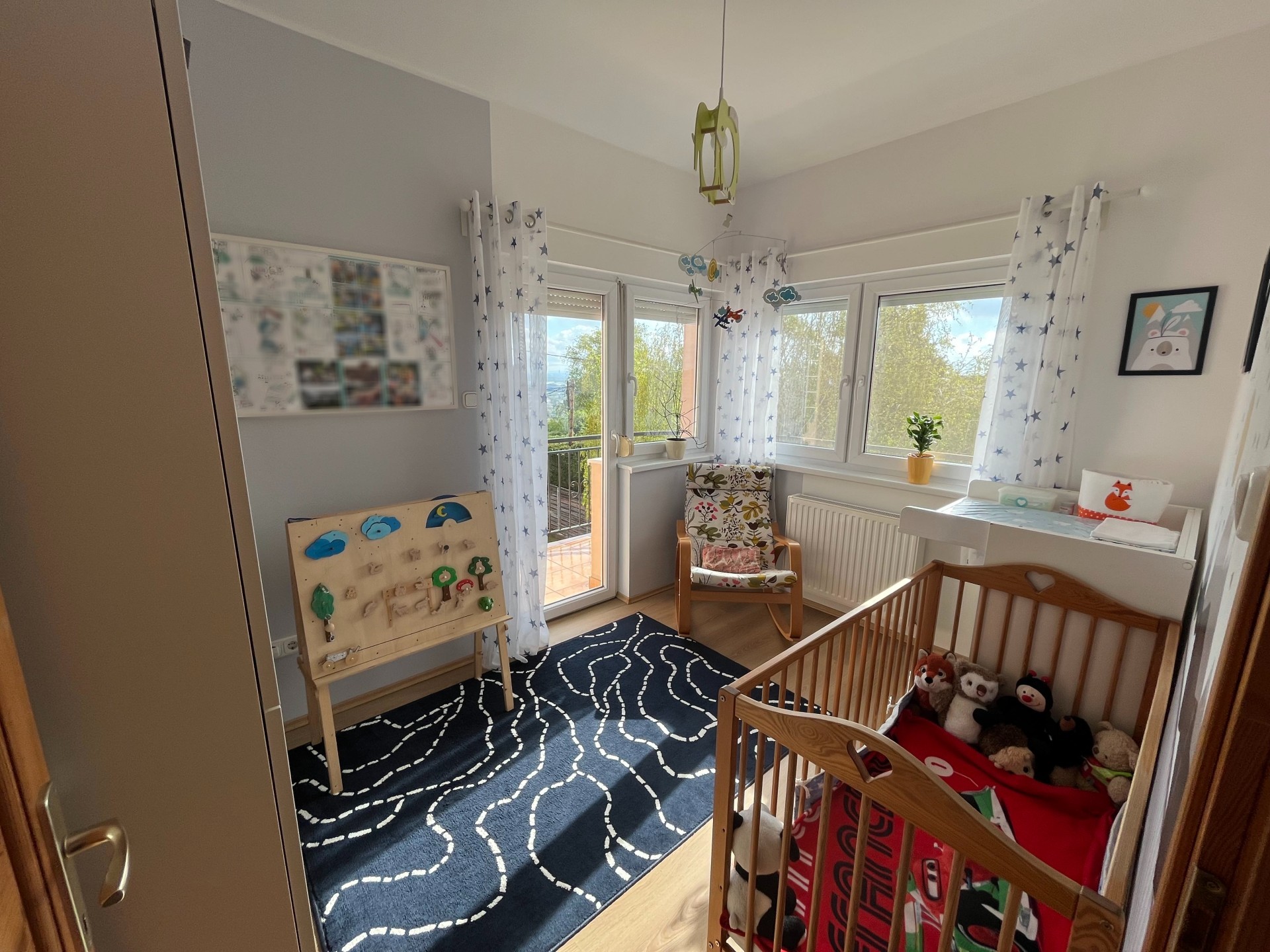 A felső szinten találhatóak a hálószobák (12,2 nm, 8,3 nm és 8,2 nm), valamint egy kádas fürdőszoba wc-vel és bidével. A 2 hálószoba saját, kertre néző erkéllyel is rendelkezik.