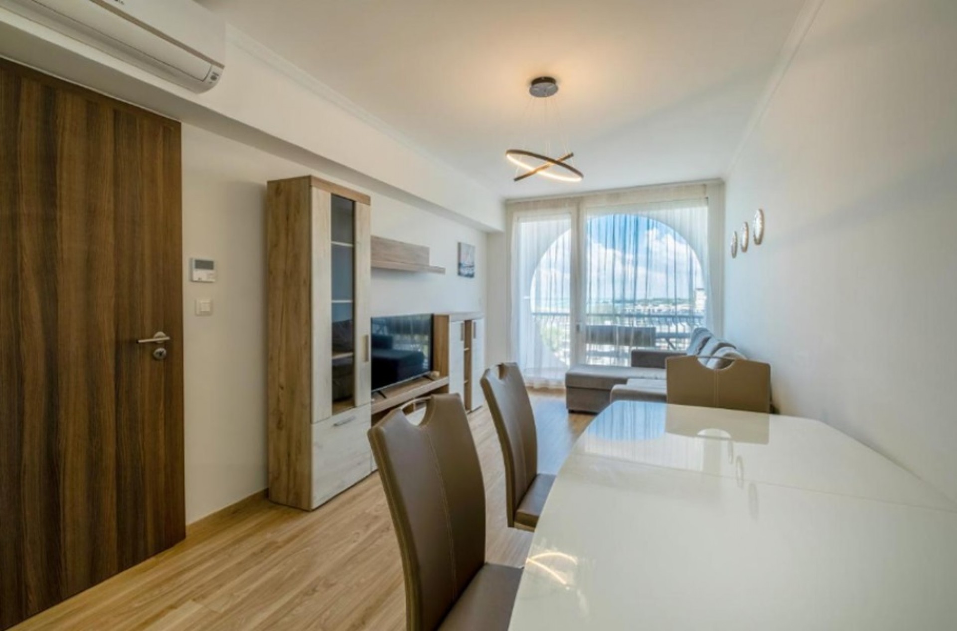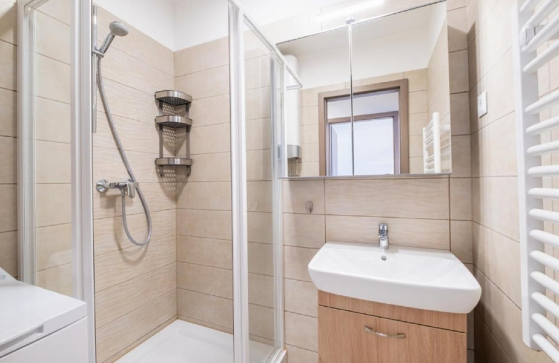 Az amerikai-konyhás nappali modern konyhával és gépészettel az ár részét képezi. A fürdőszoba zuhanykabinnal ellátott, a WC külön helyiségben van.