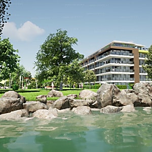 Főbb jellemzők: lakás nettó alapterülete 47m2 illetve terasz 8 m2. Amerikai konyhás-étkezős nappali, hálószoba, nagy fürdőszoba WC-vel. Keleti fekvésének köszönhetően a felkelő nap csodás látványára ébredhet. Minden helyiség külön klimatizált, a nappali és a szoba is panorámásak a tóra. A parkosított kertben 2 medence fokozza a kényelmes mindennapokat. A két liftes lépcsőház rendezett, modern, nyugalmas. Tároló illetve felszíni beálló külön vásárolható az ingatlanhoz.