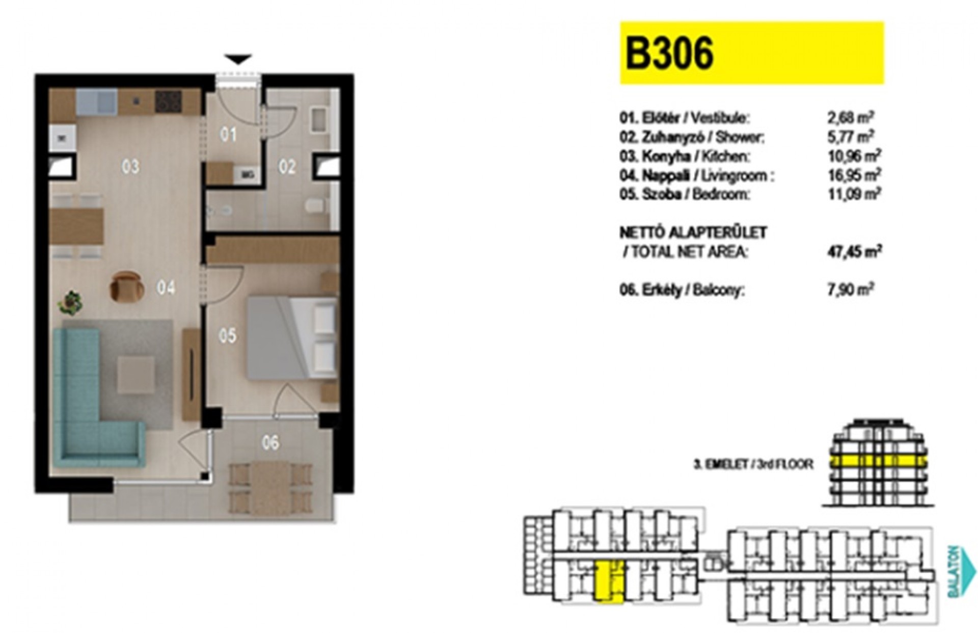 A 70 lakásos társasház szóban forgó ingatlanja 3. emeleti, panorámás, nyugati fekvésű, Tihanyi Apátságra panorámás. Nappalija és hálója is teraszkapcsolatos! A terasz üvegkorlátos, 13 nm.