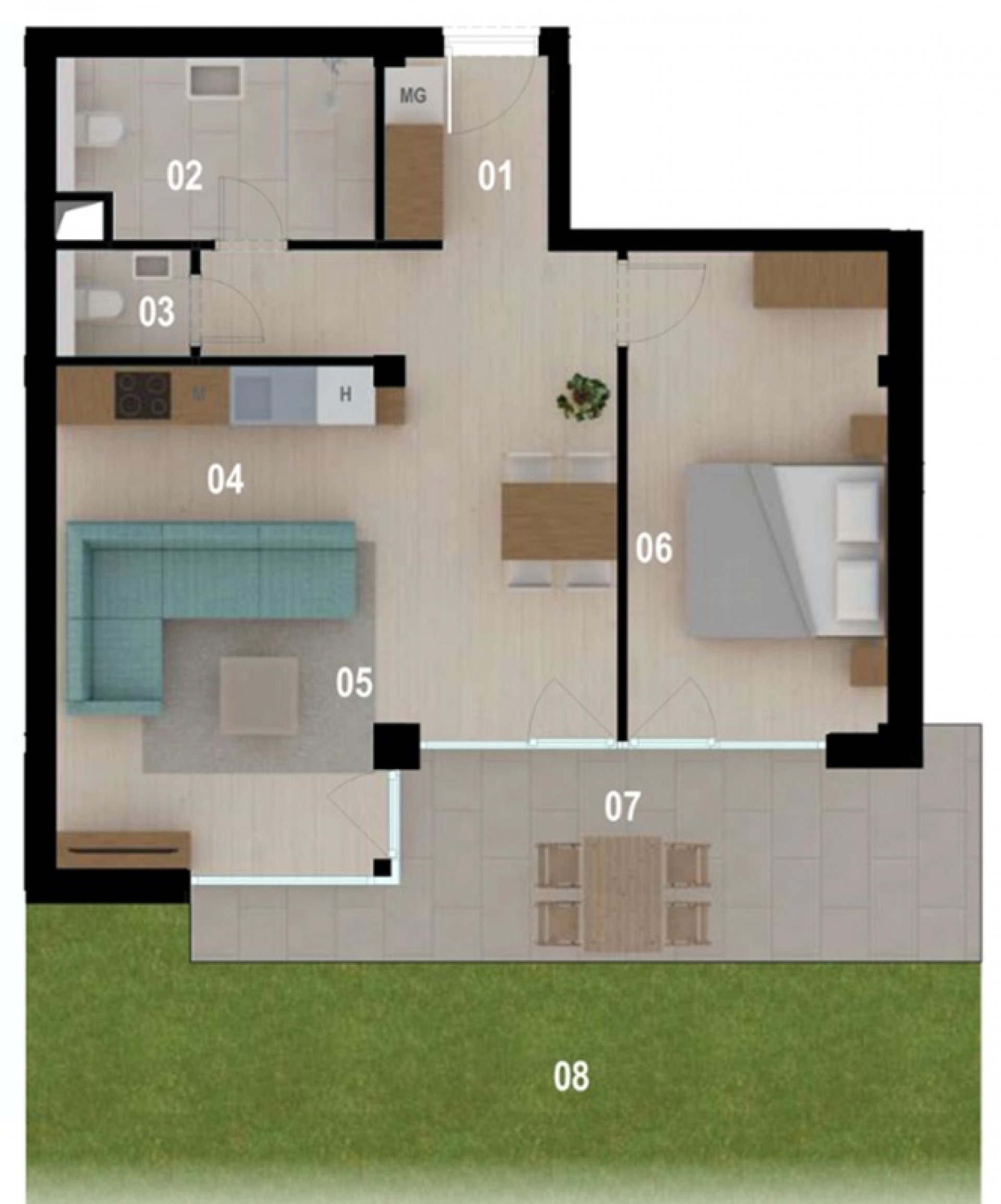 Nappali és 1 hálószobás, mindkét helyiség teraszkapcsolatos, mely 14 nm., illetve 60 nm privát kertkapcsolattal rendelkezik.
