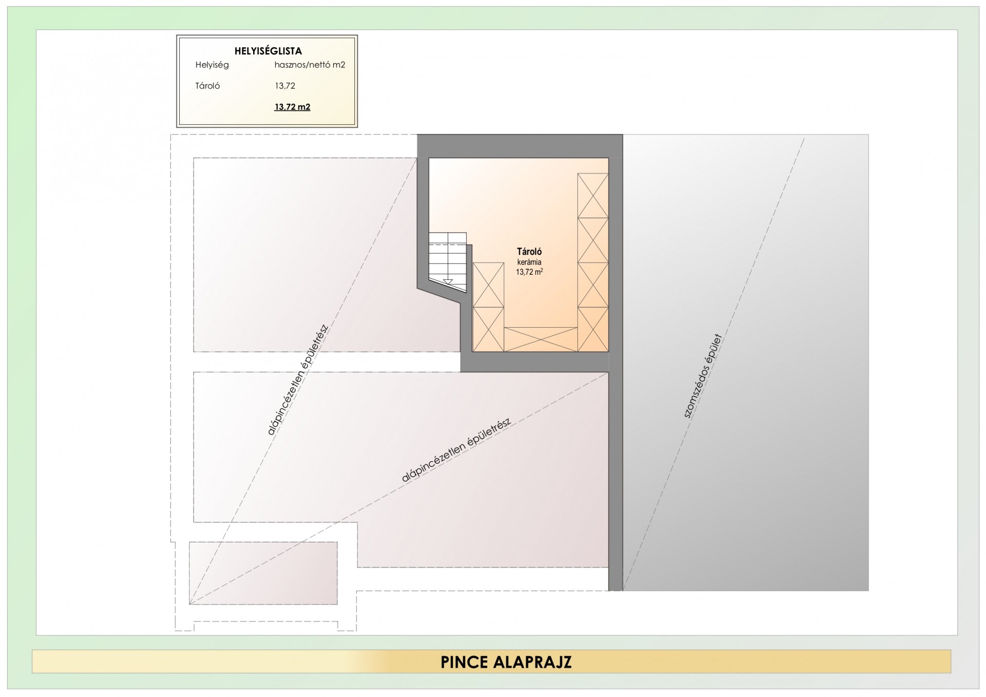 Az épület alatt egy 14 m2-es száraz, hűvös pince található. Jelenleg tárolásra illetve kamraként használják.