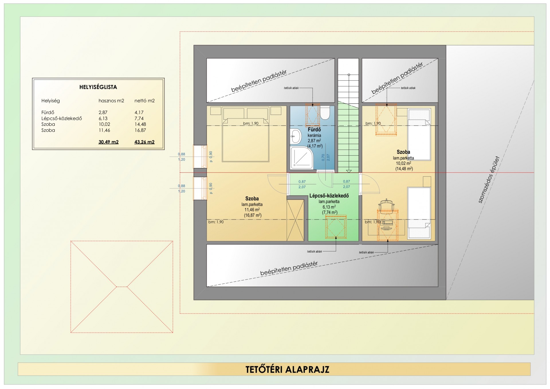 Emelet: közlekedő, fürdőszoba és két hálószoba.