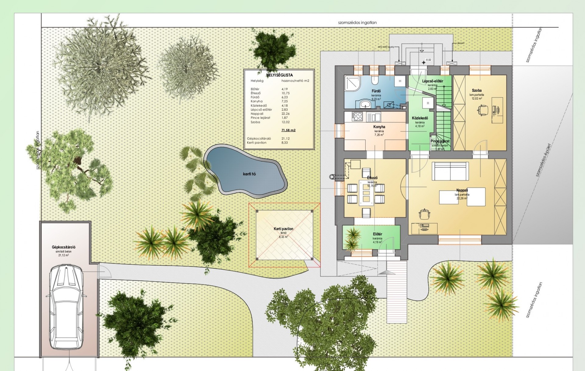 Földszint: előtér, étkező, konyha, nappali, hálószoba, közlekedő, zuhanyzós fürdőszoba.