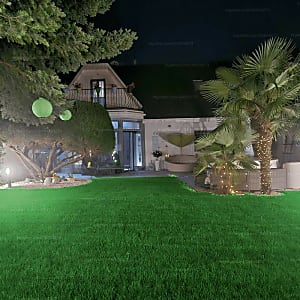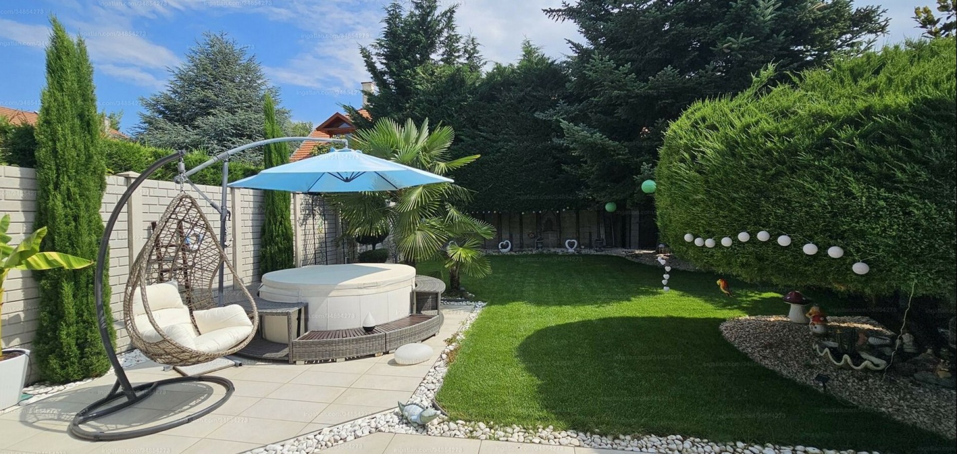 Ősfák, dísz-, és exotikus növények teremtenek mesebeli hangulatot. Könnyen karbantartható, automata öntözőrendszerrel felszerelt.