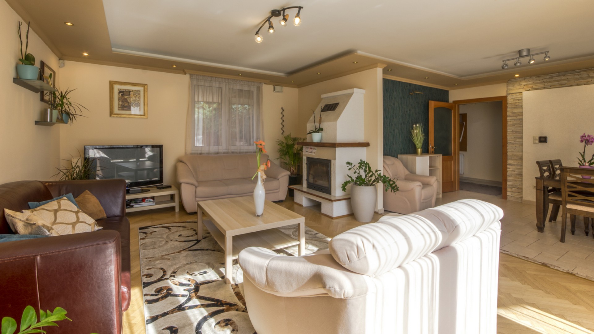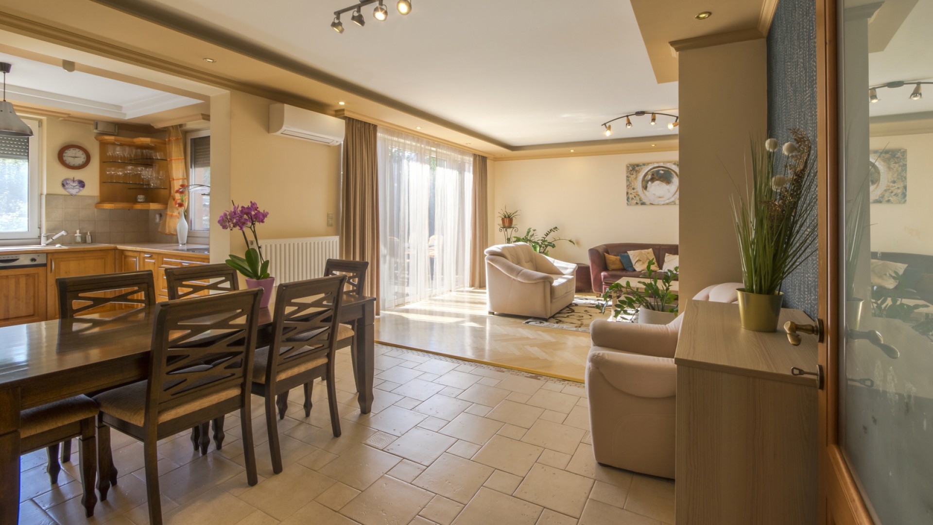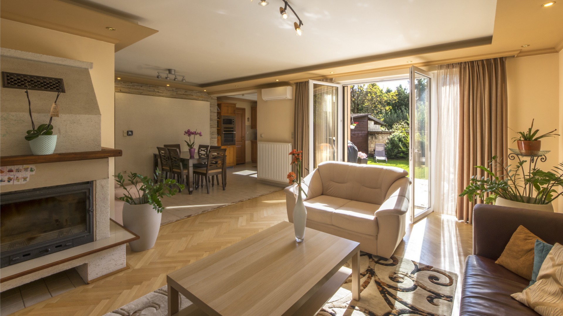 A földszinten található egy tágas, világos nappali kandallóval. A kertkapcsolatos alsó szint a rendezett, saját használatú kertre néz. A konyha ablakai szintén az udvarra néznek, és külön kamra is tartozik hozzá.