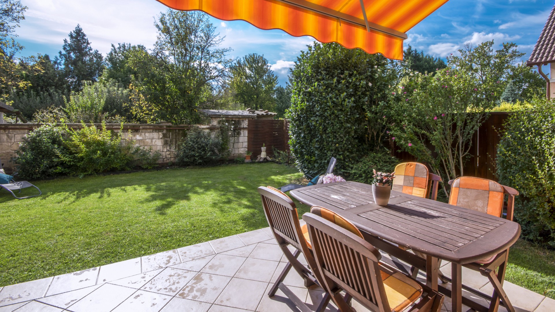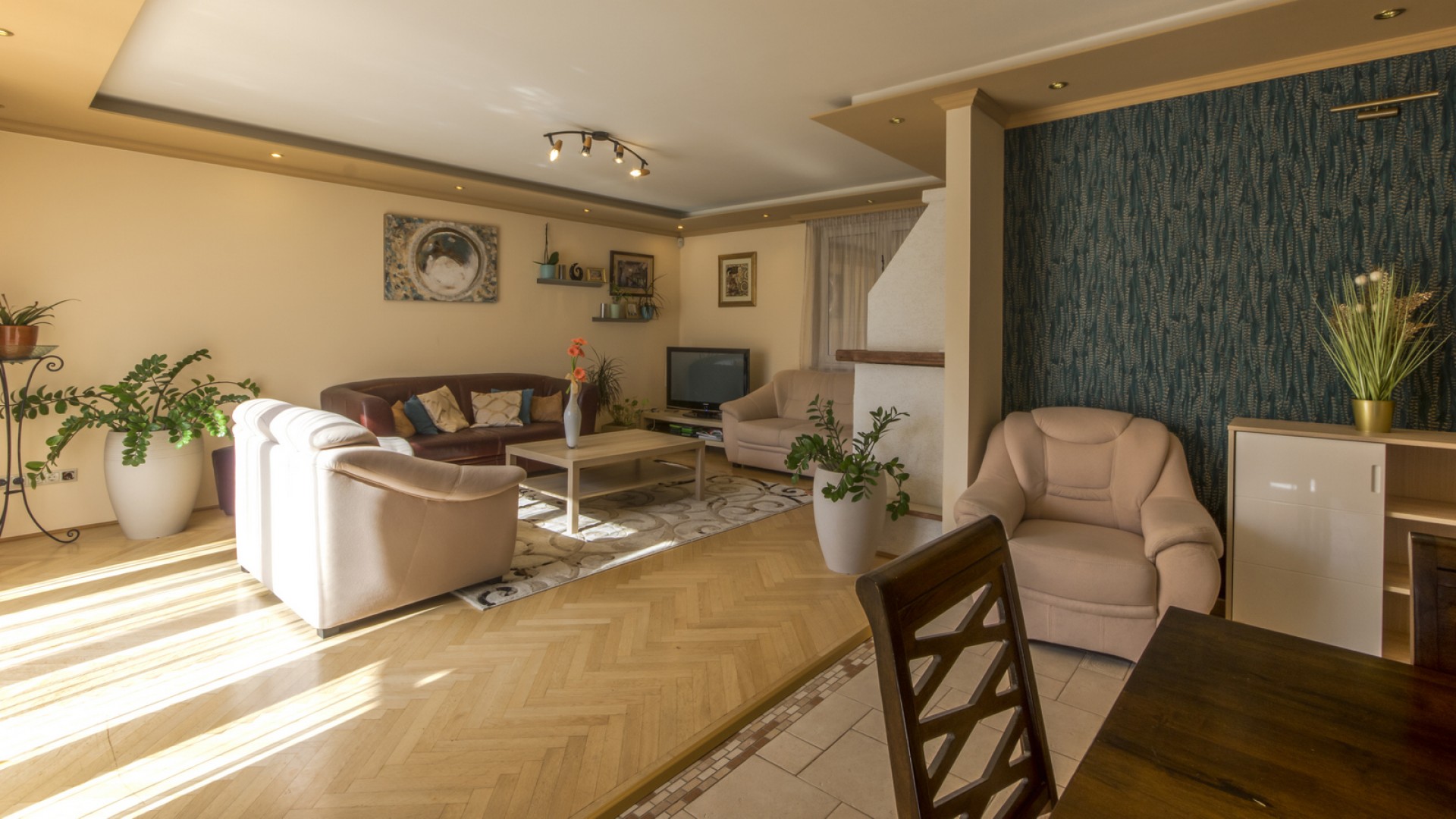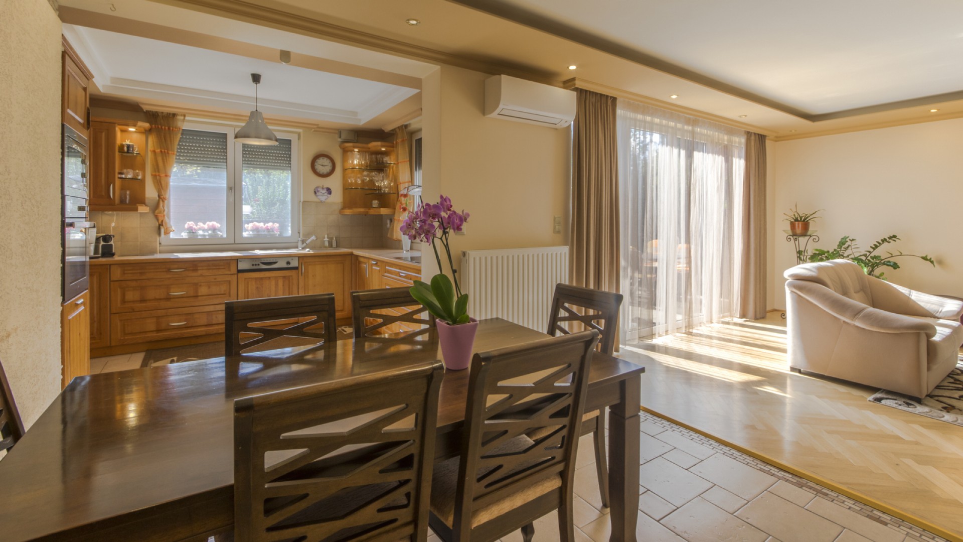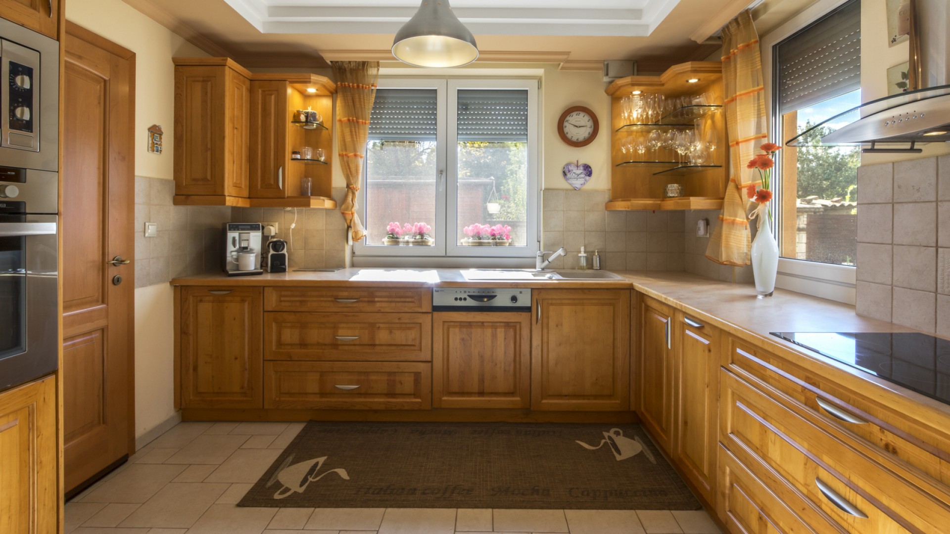 A földszinten található egy tágas, világos nappali kandallóval. A kertkapcsolatos alsó szint a rendezett, saját használatú kertre néz. A konyha ablakai szintén az udvarra néznek, és külön kamra is tartozik hozzá.