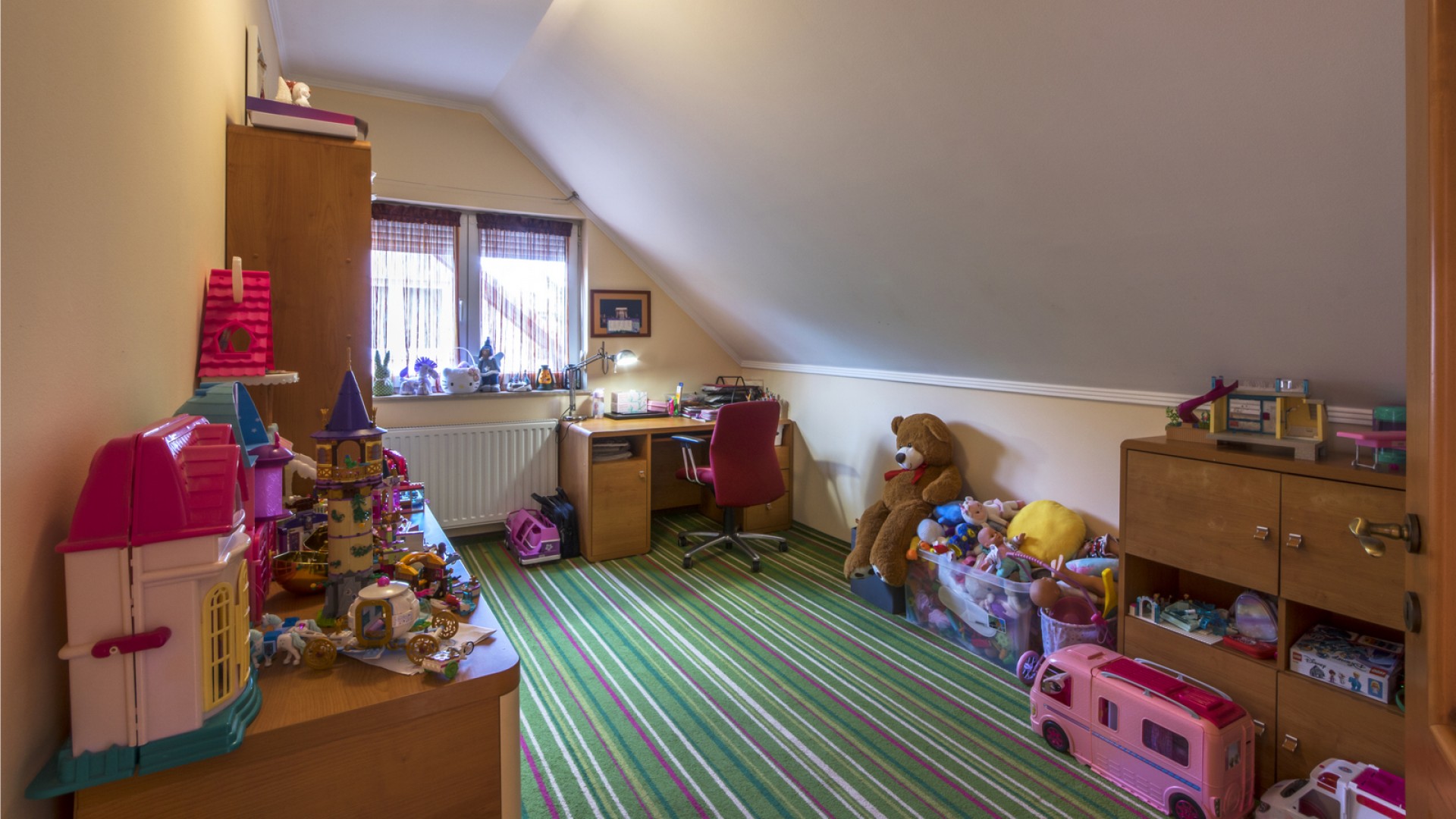 Az ideális kialakítású ház emeletén 3 hálószoba van. A szülői hálóhoz tartozik egy külön gardrób helyiség is. Az emeleti fürdőszoba nagyon szép, igényes, dupla mosdóval felszerelt.